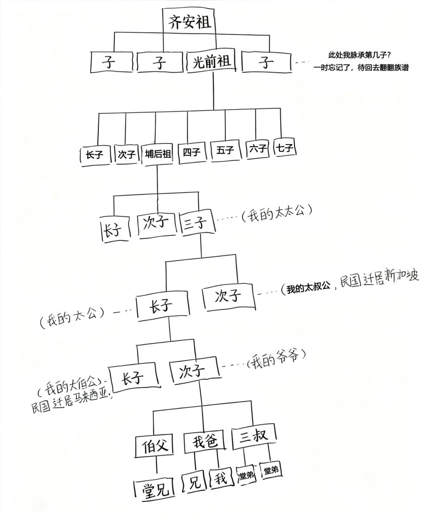 奶奶的后裔,大伯(非她血脉)、大姑姑(非她血脉)、父亲、二姑、三姑、三叔、小姑姑。