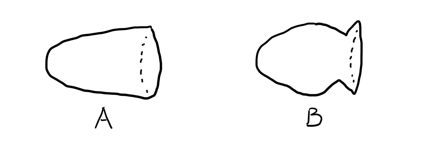 一开始我戴耳塞的时候,也像大多数人一样觉得耳道有异物会很不舒服,不过我很快发现这是耳塞形状的关系。一般的耳塞(如图 A)是一个圆头的锥体,边缘是一条直线,试过另外一种形状接近扑克牌中黑桃(♠️)的耳塞(如图 B)之后,我发现佩戴耳塞的舒适度提高了不少。市面上还有不少形状稀奇古怪的耳塞,价格是一般耳塞的十多倍,我没有试过,但我觉得没必要买那么贵的,因为物美价廉的选择其实不少。