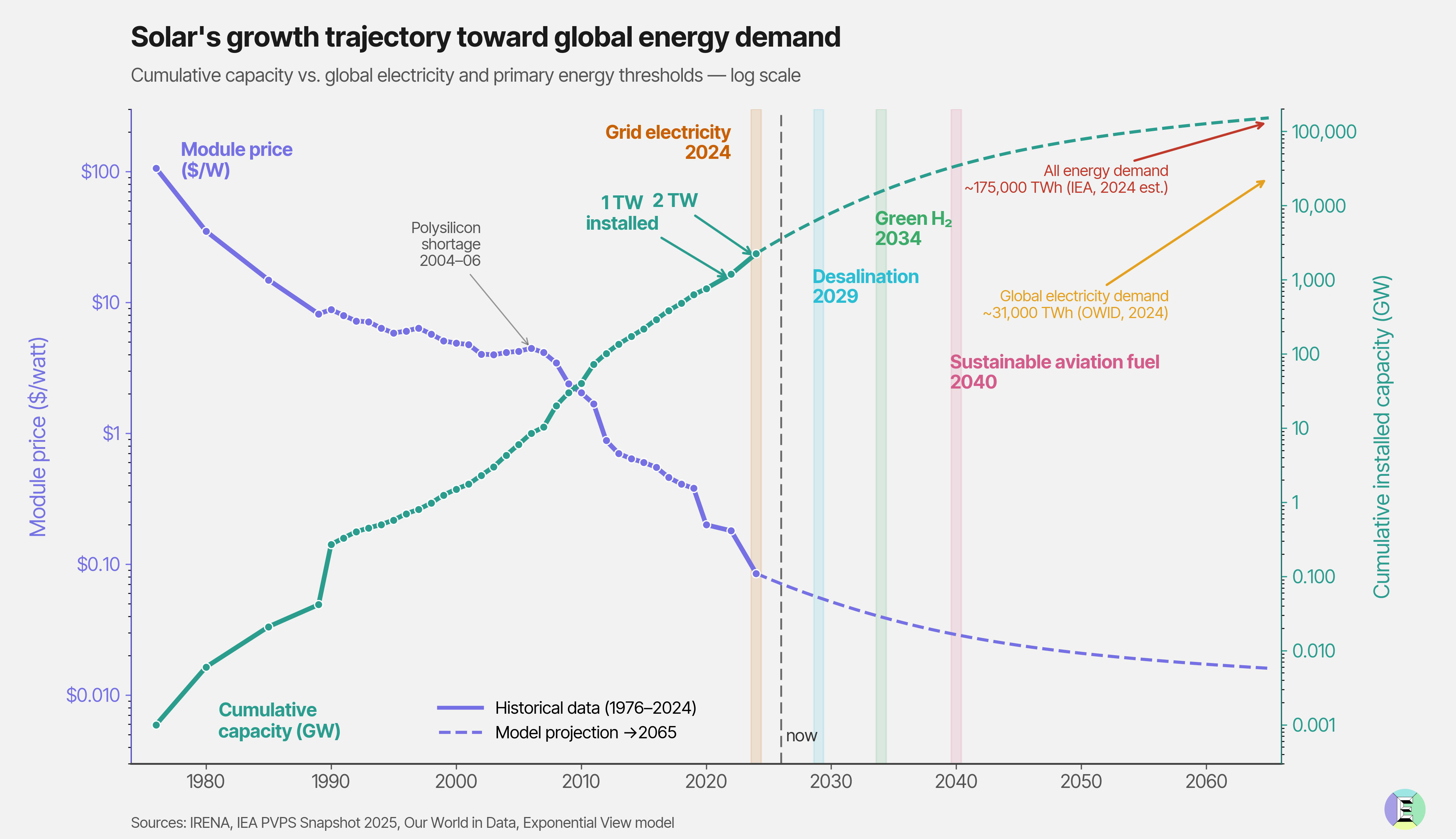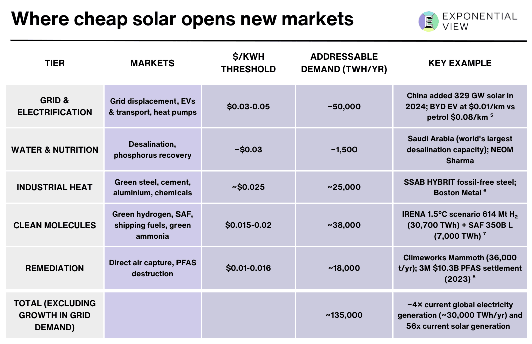 This is the solar supercycle, a self-reinforcing loop where every cost reduction opens a new market and every new market funds the next cost reduction. To show its potential, we built a model grounded in fifty years of Wright’s Law data that maps when each threshold arrives and which markets open up. The model allows you put put in your own assumptions: bearish, bullish or something in between. Paying members have had the model since Thursday. Today it opens to everyone: solar.exponentialview.co 🌞