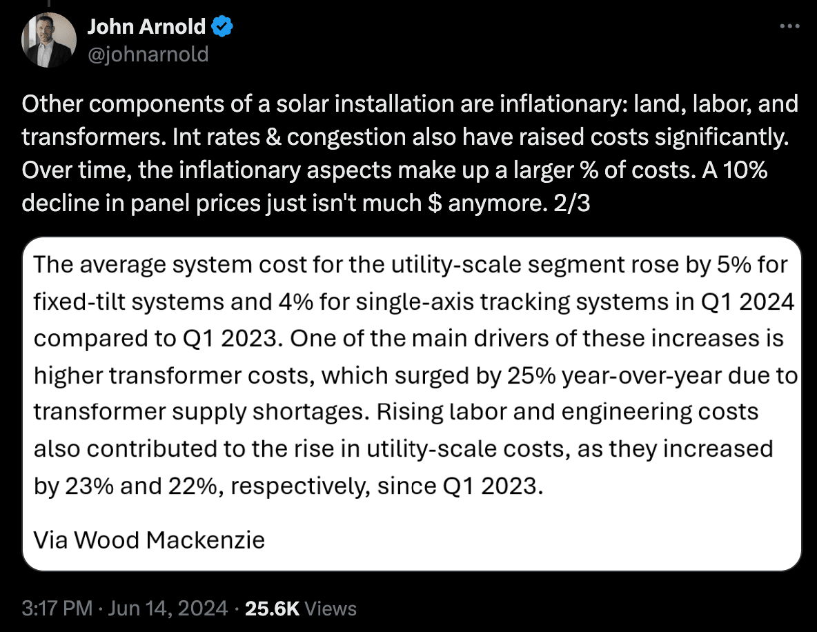 This is the strongest version of the bear case. The bear is not arguing that modules won’t keep getting cheaper but that it doesn’t matter, because the non-module costs dominate and don’t follow the same curve.