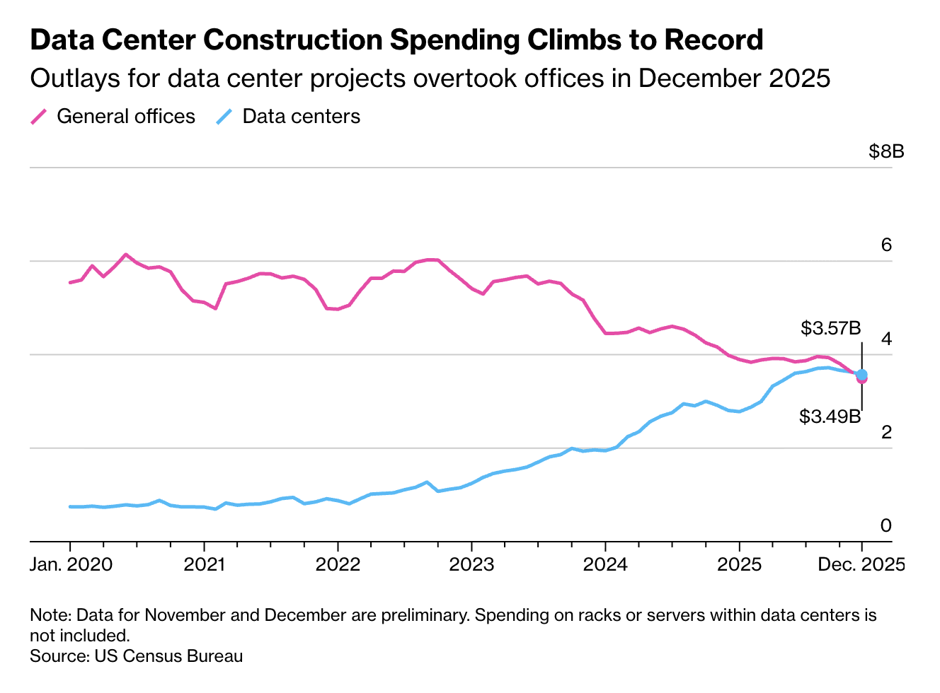 Bricks and bytes ↑ Data center spending overtook office spending in December 2025.