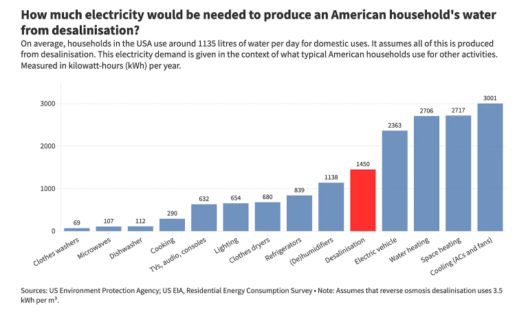 Two billion people lack access to safely managed drinking water. We’ve had the core technology to fix a lot of this for decades in reverse osmosis desalination. The electricity bill is a major hurdle. Running a modern plant to turn seawater into fresh water takes 3 to 3.5 kilowatt-hours of power for every cubic meter. At twelve cents a kilowatt-hour, that alone is 35 to 40 cents before you’ve built the plant, hired anyone, or laid a single pipe. Total production costs run to $1 to $2.50 per cubic meter, at or above what American households pay for tap water. So desalination stayed a rich-country luxury. At three-cent solar, the energy cost falls to a dime per cubic metre. When the price of electricity goes even lower, energy will stop being the main constraint altogether.