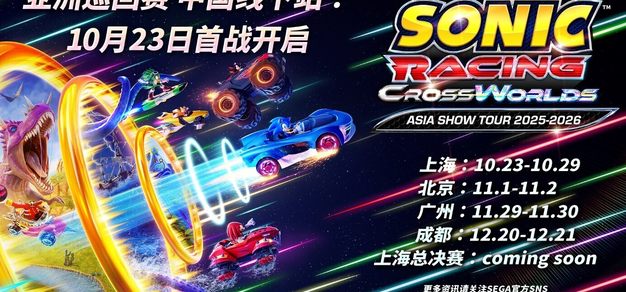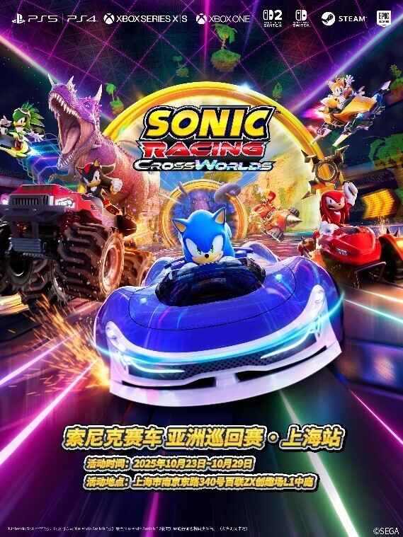 由世嘉的竞速游戏精锐团队开发的全新赛车游戏《索尼克赛车 交叉世界》将于10月开启亚洲巡回赛中国线下站,由上海出发,陆续前往北京、广州、成都等城市,带来一场用速度与激情席卷全国的疾速狂欢。玩家可在活动现场直接参赛,在各城市赛比拼车技、赢取限定奖品,并有机会晋级最终顶点——上海总决赛,角逐全国冠军荣耀!总决赛日期及地点将在日后公布,敬请期待。