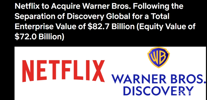 网飞公司宣布将以827亿美元收购华纳兄弟探索公司,包括其影视制作部门、HBO Max以及HBO频道。这项收购将通过现金加股票的形式完成。 华纳兄弟探索公司每股估值27.75美元,整个企业估值大约为827亿美元(其中股权价值约为720亿美元)。