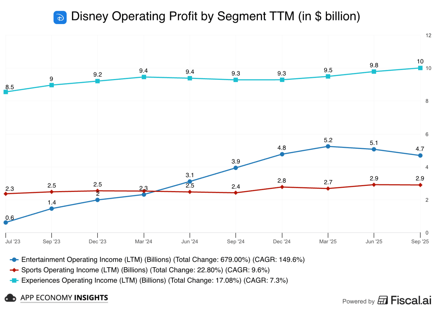 🎢 Epic Universe still surging: Theme parks revenue continued its massive run, jumping 19% to $2.7 billion. EBITDA grew 13% to $958 million, fueled by the first full quarter of Epic Universe driving record attendance and per-capita spending.