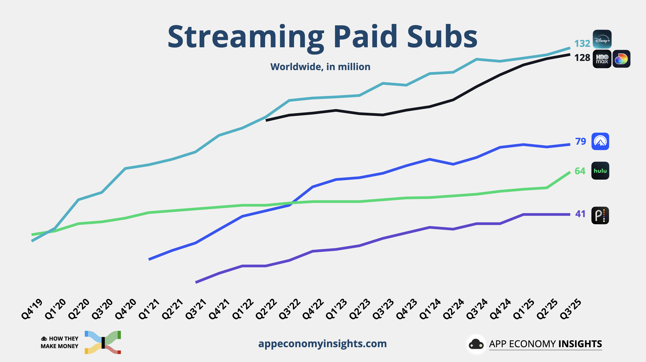 Of course, the outlier here is Hulu, jumping from 55 million to 64 million in the September quarter. It was almost entirely driven by distribution-led gains rather than organic standalone growth. Disney expanded its Charter bundle footprint during the quarter, pulling millions of households into Hulu’s subscriber count even if they never actively signed up for the service.
