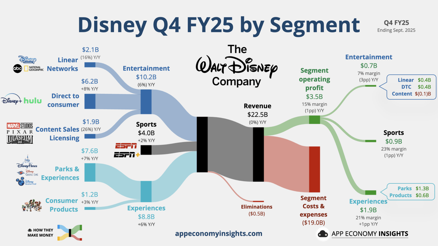🍿 Content faces tough comps: Content Sales fell 26%, largely because last year included Inside Out 2 and Deadpool & Wolverine. Lilo & Stitch remained the highest-grossing Hollywood film of the year. Q1 FY26 will see a $400 million operating income hit from the theatrical timing of Zootopia 2 and Avatar: Fire and Ash.