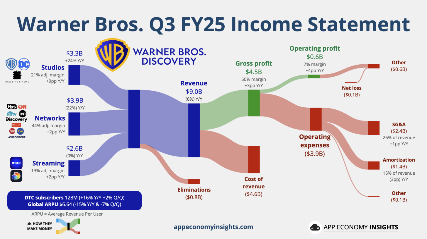 💵 Debt down, but net loss recorded: WBD reported total revenue of $9.0 billion ($0.2 billion miss), but its net loss of $148 million or 6 cents/share was ahead of low expectations ($0.01 beat). The loss included $1.3 billion in amortization and restructuring costs. The company paid down another $1.2 billion in debt, bringing gross debt to $34.5 billion and holding net leverage steady at 3.3x.