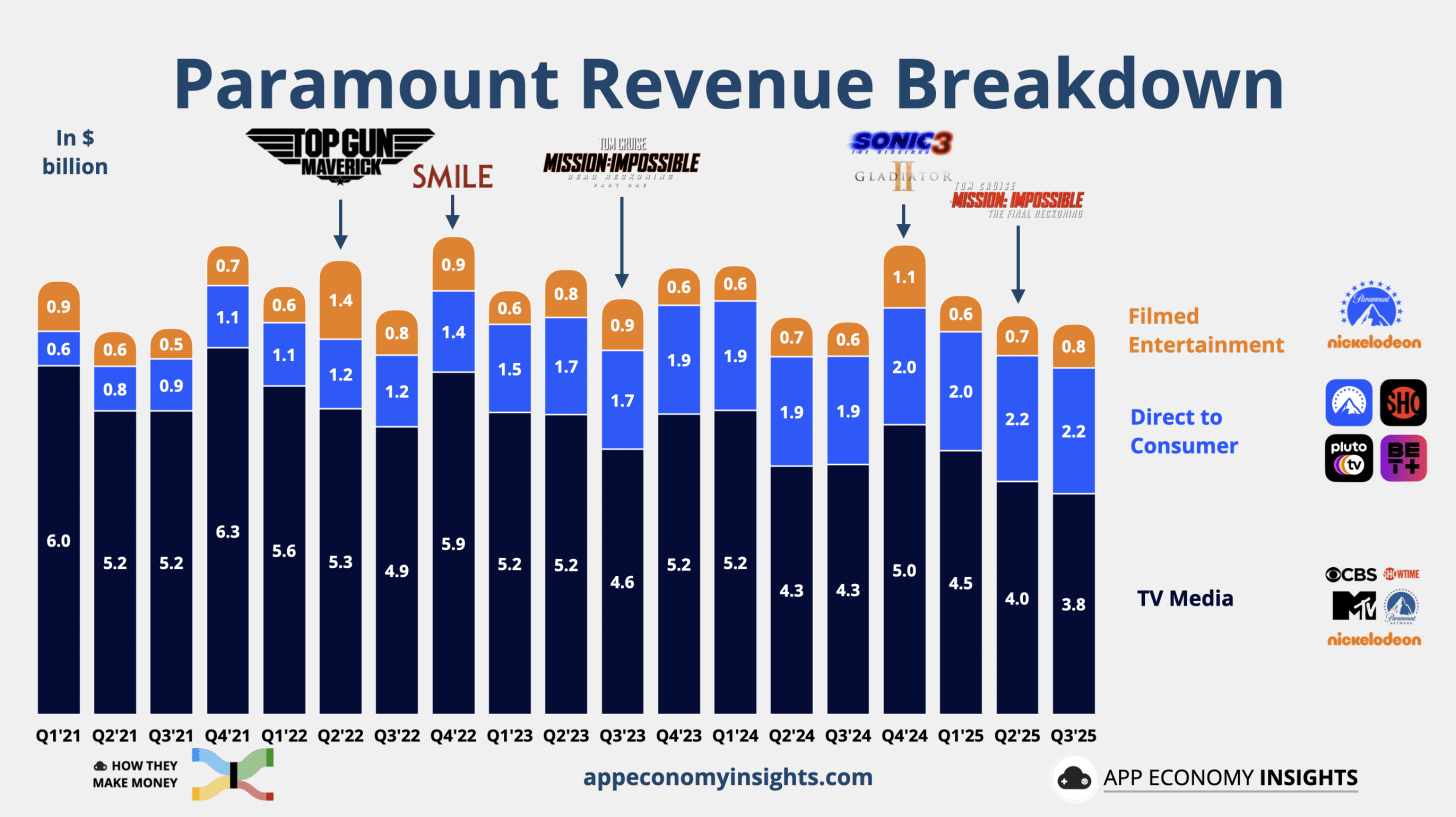 🎬 Studio stumbles: The Filmed Entertainment segment swung to a loss of $49 million. Revenue grew 30% to $756 million, but this was attributed to consolidating Skydance’s licensing. The theatrical slate underperformed, with films like Smurfs and The Naked Gun cited as disappointments.