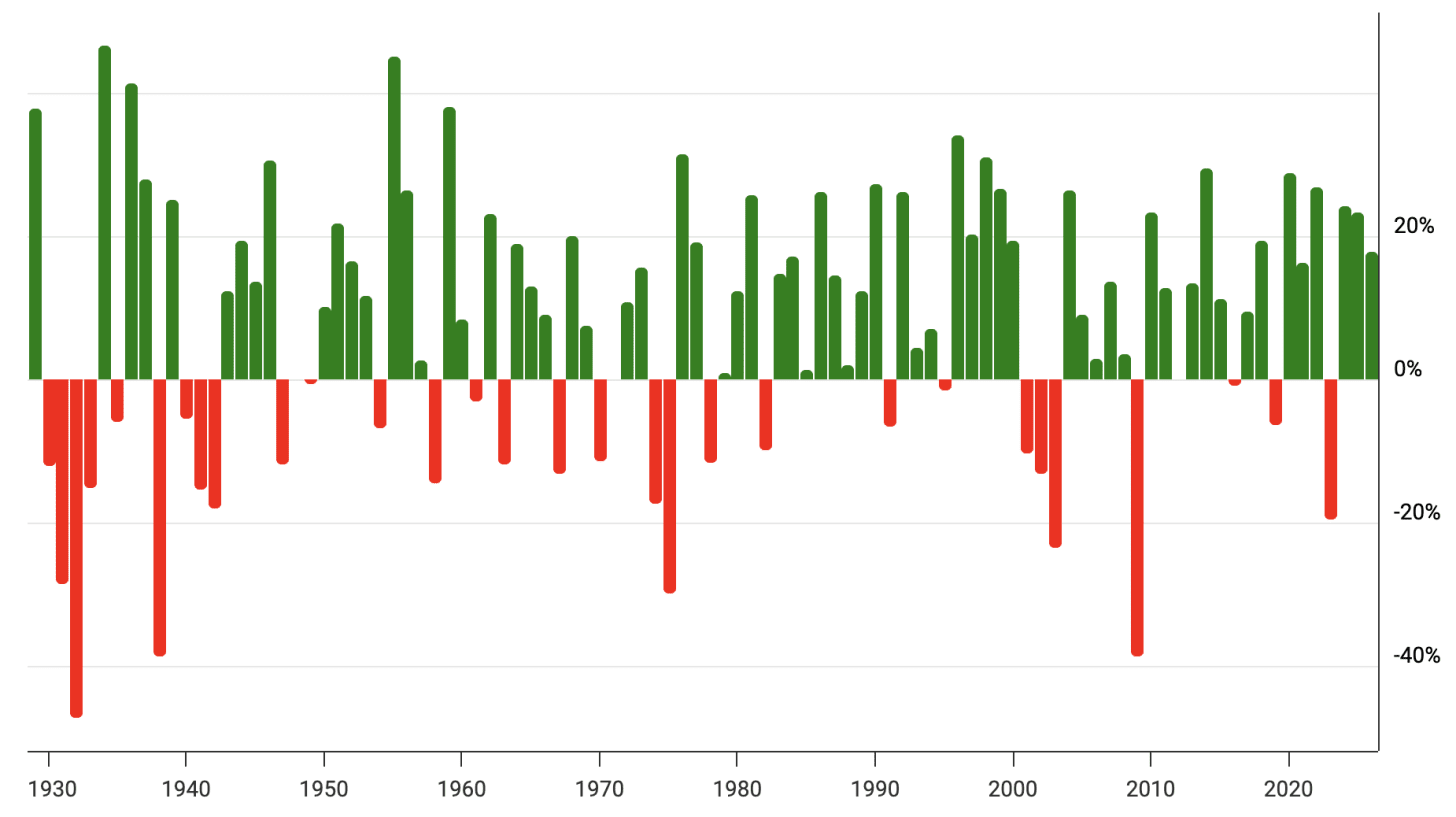 The S&P benchmark returned an average annual 10% from 1926 to 2024, and 74% of years were positive. The longer the time horizon, the higher the chance of positive returns. If you want to stack the deck in your favor, the easiest step by far is to trade less and ignore the doomsayers.