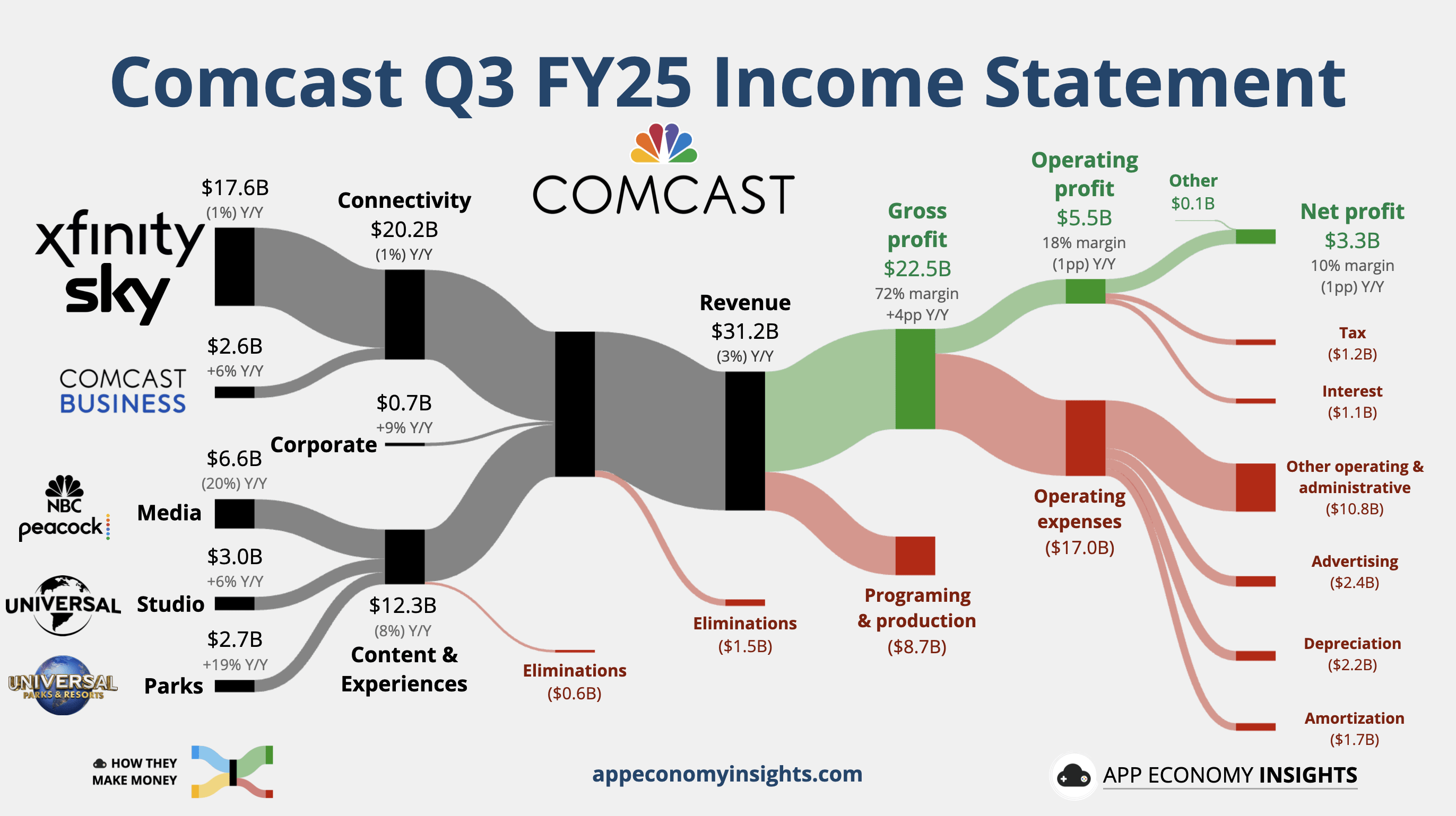 📉 Broadband losses improve: This was the main story. Comcast lost only 104,000 broadband customers in Q3, a major improvement from Q2’s 226,000 loss and far better than the ~140,000 analysts had feared. Pay-TV losses also slowed to 257,000 (the smallest loss in several years). Wireless was the star again, adding a new record of 414,000 lines, bringing its total to 8.9 million.