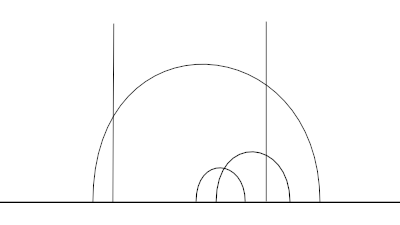 We can define a metric on ℍ as follows. To find the distance between two points u and v, draw a line between the two points, and let a and b be the ideal points at the end of the line. By a line we mean a line as defined in the geometry of ℍ, what we would see from our Euclidean perspective as a half circle or a vertical line. Then the distance between u and v is defined as the absolute value of the log of the cross ratio (u, v; a, b).