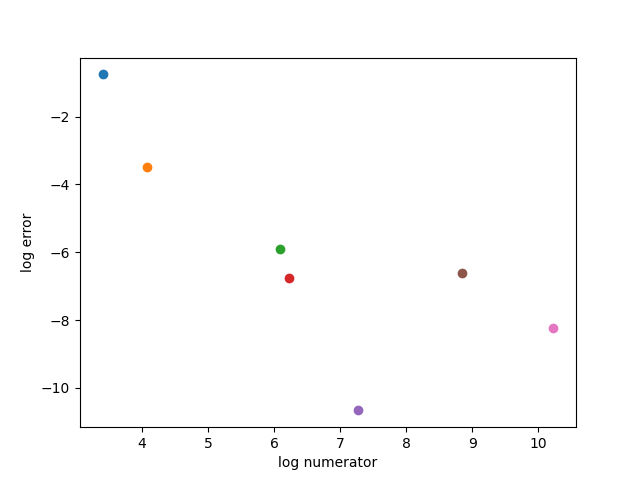 Let’s look at the accuracy of several approximations for L. We’d like an approximation that is not only accurate in an absolute sense, but also accurate relative to its complexity. The complexity of a fraction is measured by a height function. We’ll use what’s called the “classic” height function: log( max(n, d) ) where n and d are the numerator and denominator of a fraction. Since we’re approximating a number bigger than 1, this will be simply log(n).