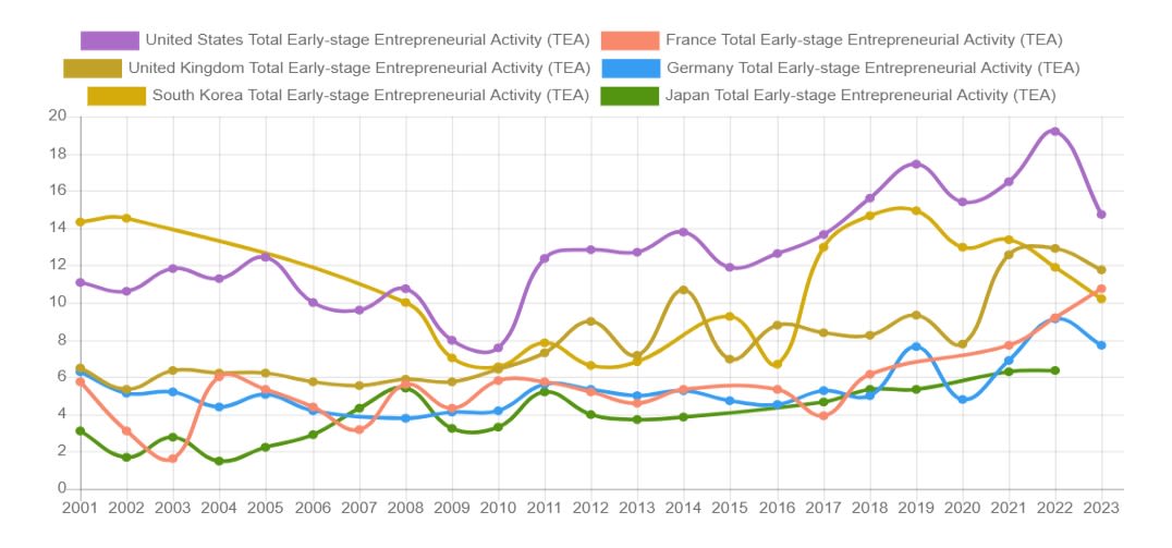 But despite some very real improvement, Japan still has a lot of opportunity to increase entrepreneurship. The Global Entrepreneurship Monitor shows Japan lagging many other rich countries in terms of total entrepreneurial activity as of 2022: