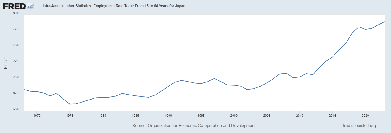 In the 1990s, after Japan’s real estate bubble burst, the government used both of these policy tools to prevent unemployment from rising too high. And in the 2010s, former Japanese Prime Minister Abe Shinzo and Bank of Japan Governor Kuroda Haruhiko used both of these policies to put more of the Japanese population to work.