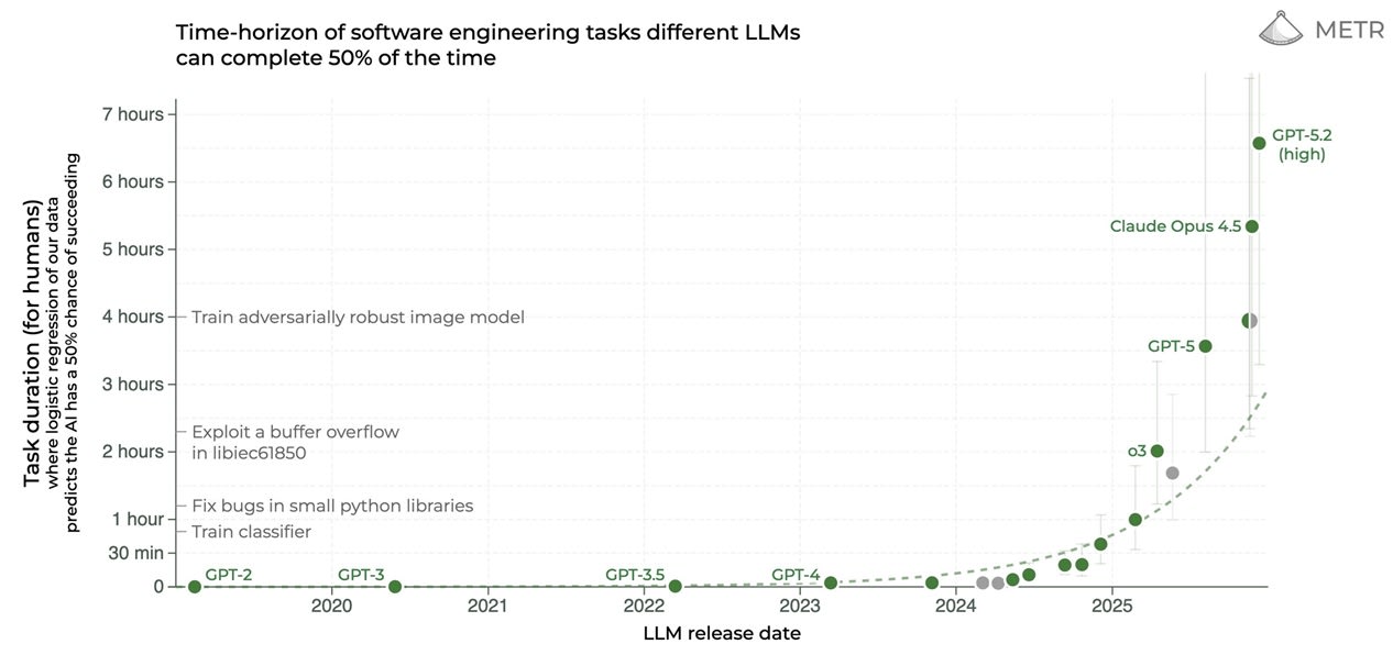 Right now, there are some cognitive things that humans still do better than AI, but that will probably not last. The entire might of the world’s technological innovation system is now being thrown into making AI better, and there is no sign of a slowdown in progress. One of the main things AI couldn’t do until recently was to work on a task for a long period of time. That’s changing fast. AI models are flying up the METR curve,1 which tries to measure the length of time a human would require to complete a software engineering task that AIs can do: