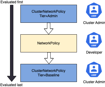 新引入的 ClusterNetworkPolicy 是集群级别资源,管理员可以直接选中多个 Namespace 下的 Pod 进行策略控制。同时 Admin Tier 的策略可以先于 NetworkPolicy 生效,这样集群管理员只需要少量的 Admin Tier 策略就可以控制住整个集群的红线行为。