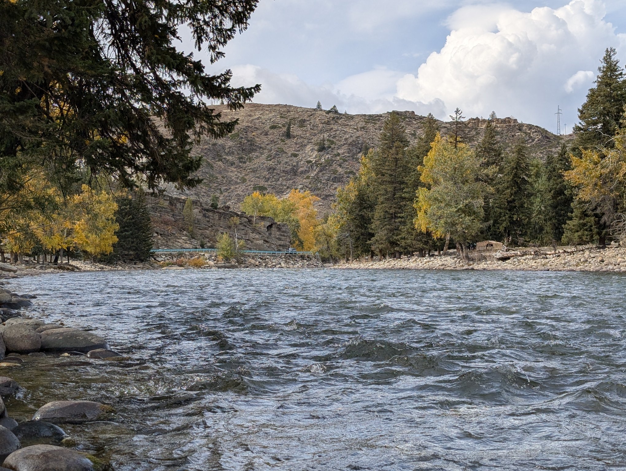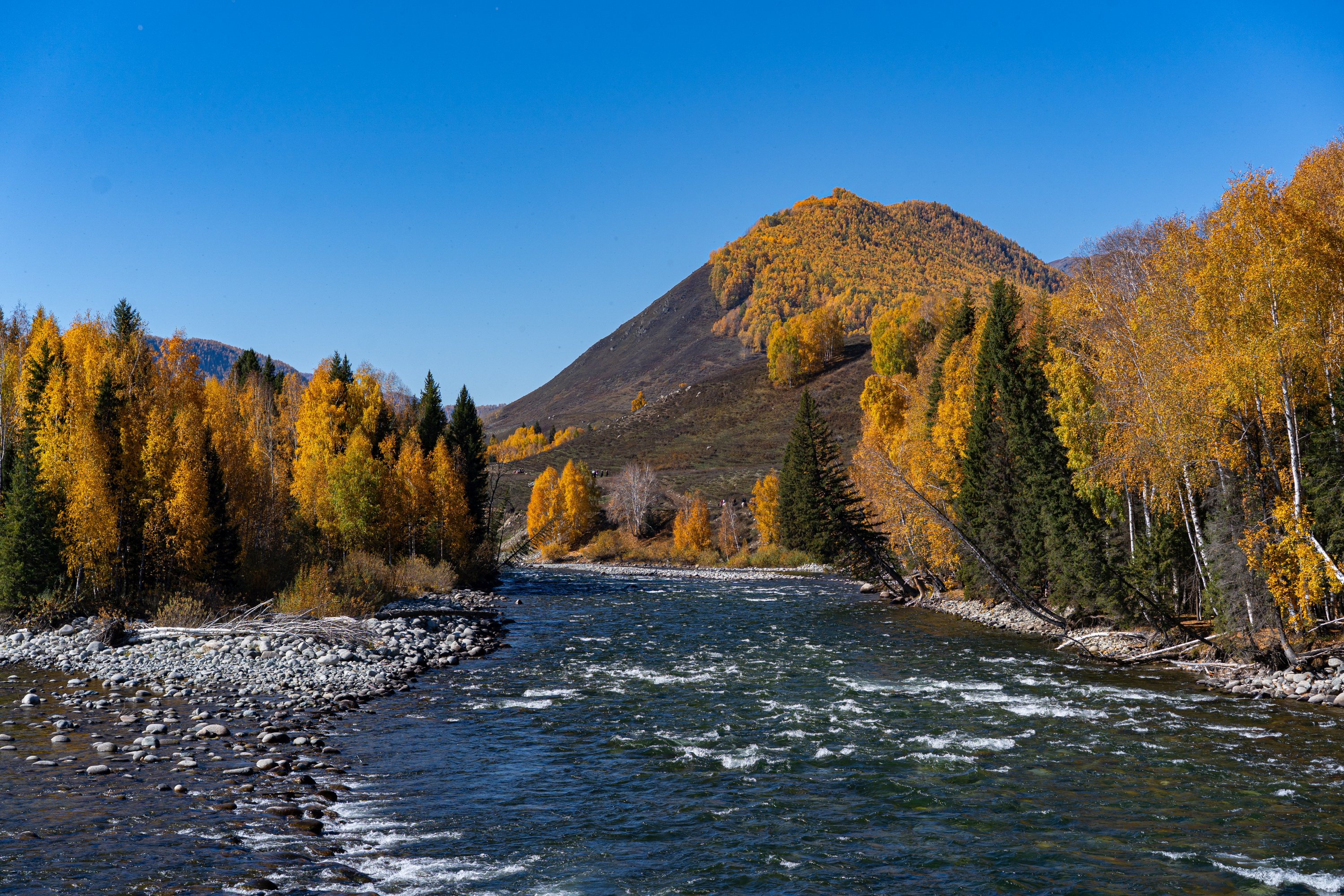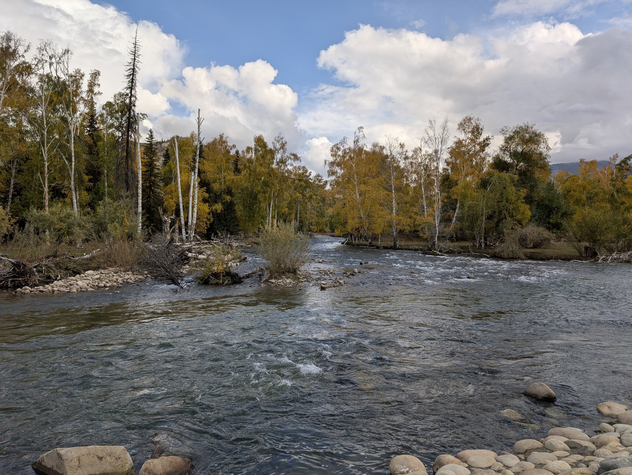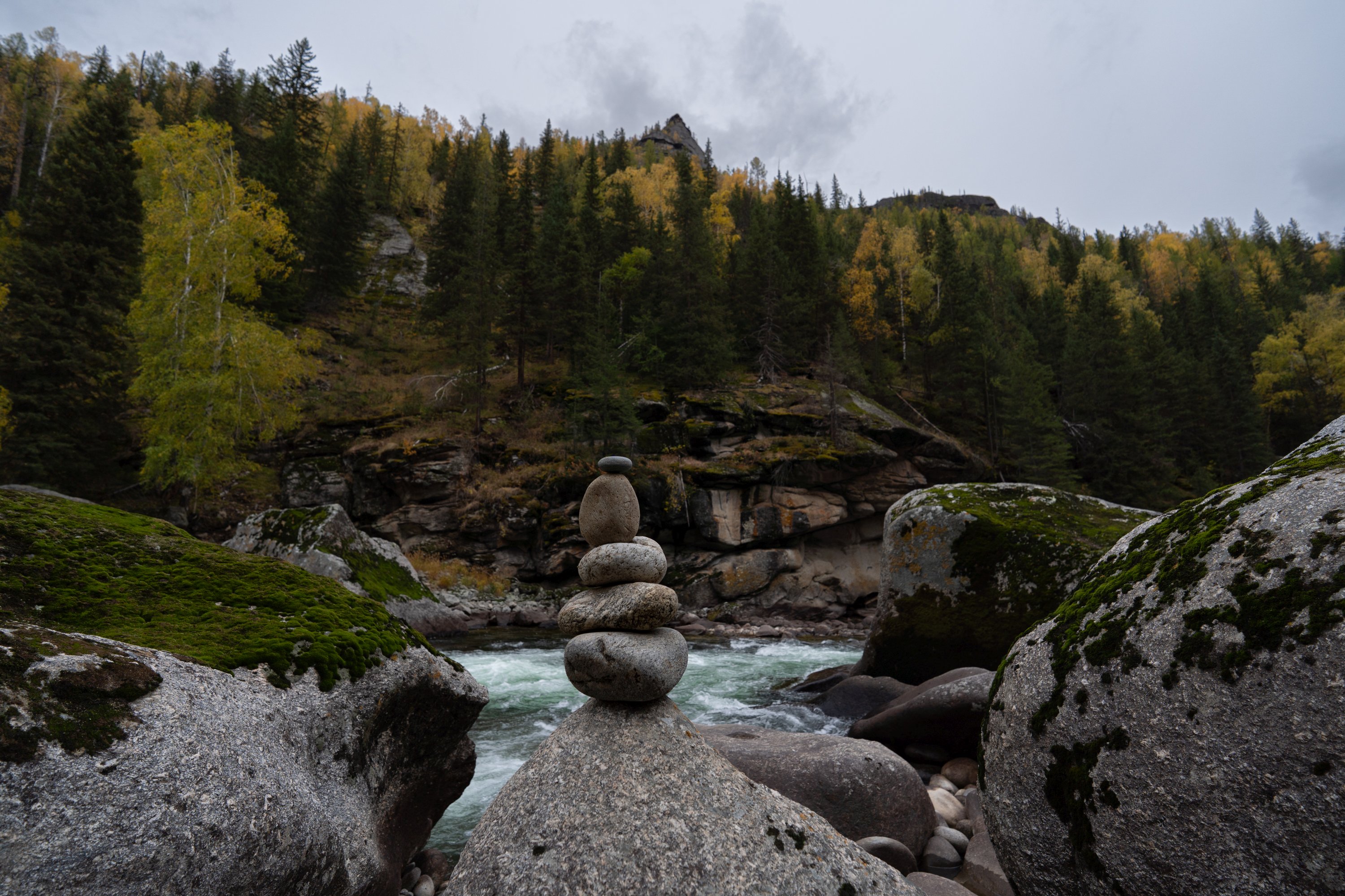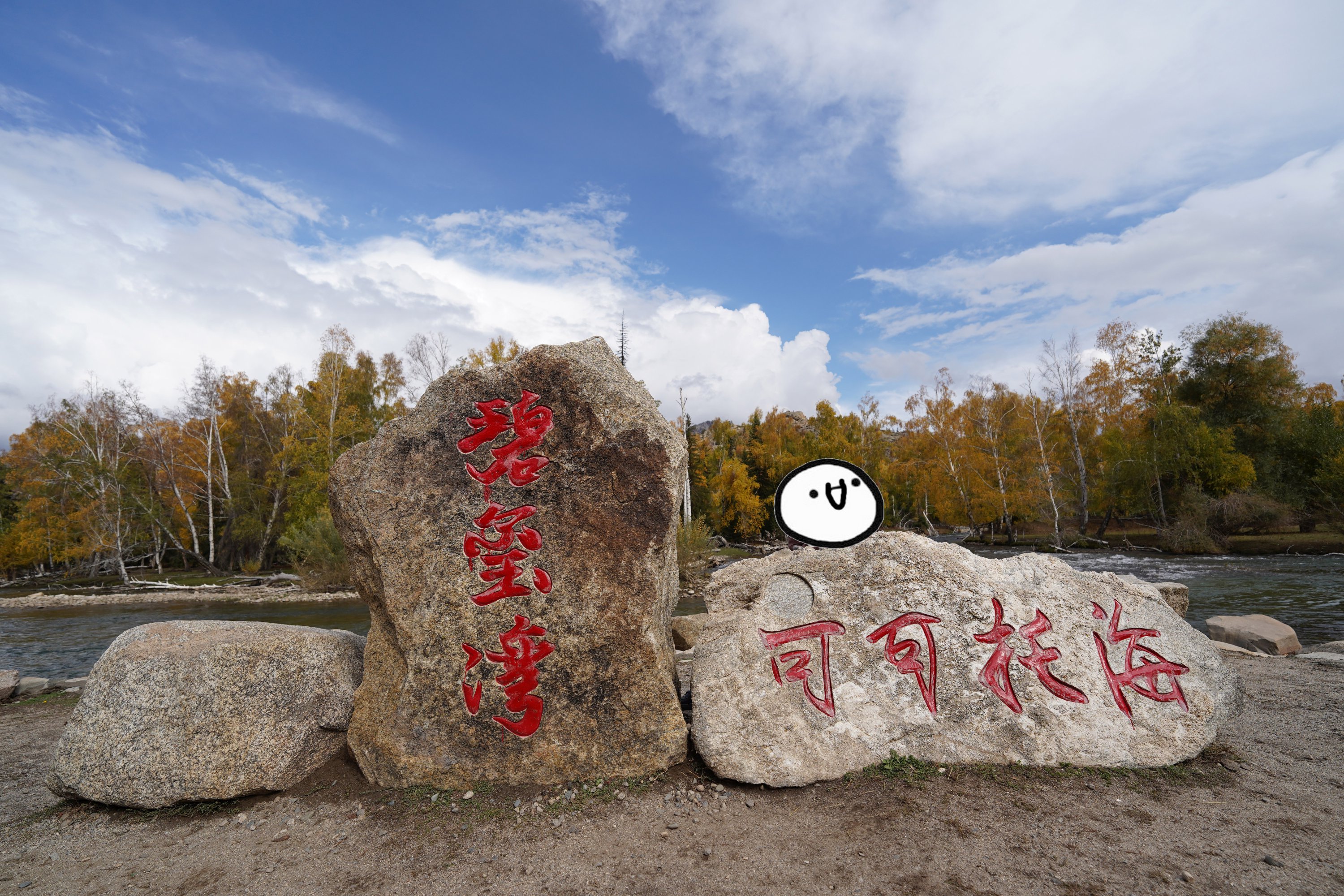 经过了象形山石区,看导览图里面应该还有一个靠近边境区域的喀拉卓勒瀑布。简单走了一段预感路途可能比较远,就没往里走了。看到一条岔路,向着额尔齐斯河边走去。到了河边在边上磊磊石堆,在河边磊着大量这样的石堆。