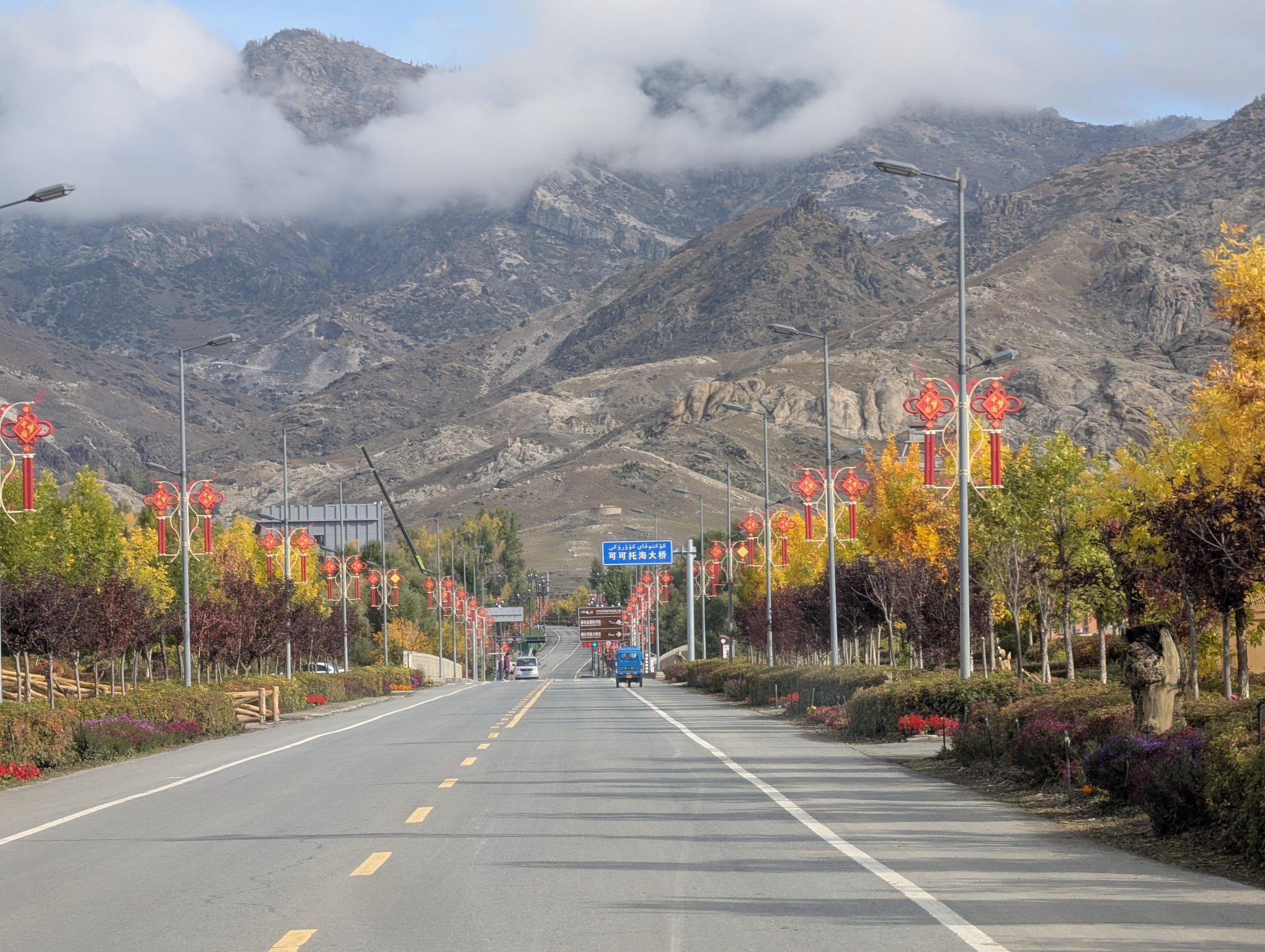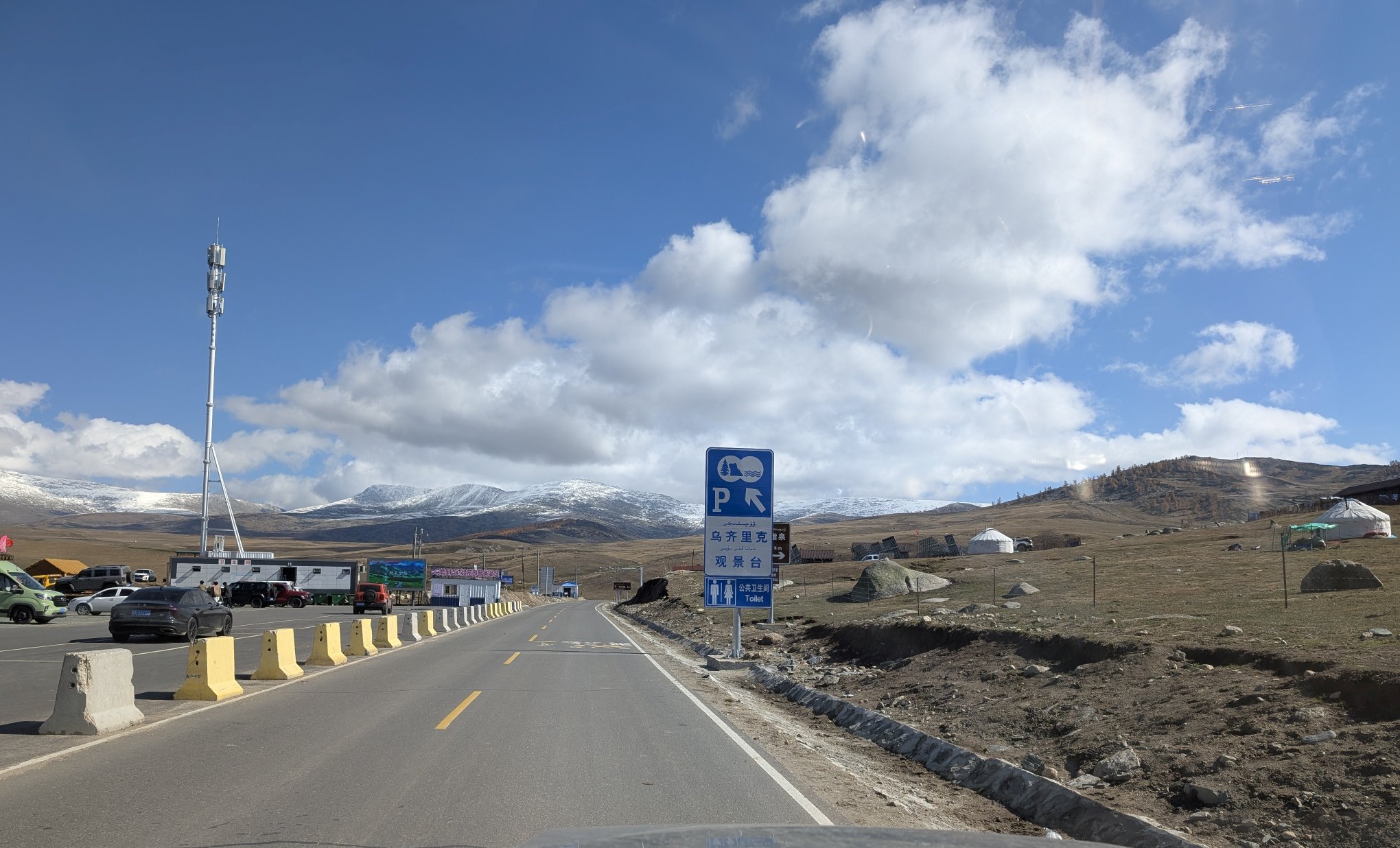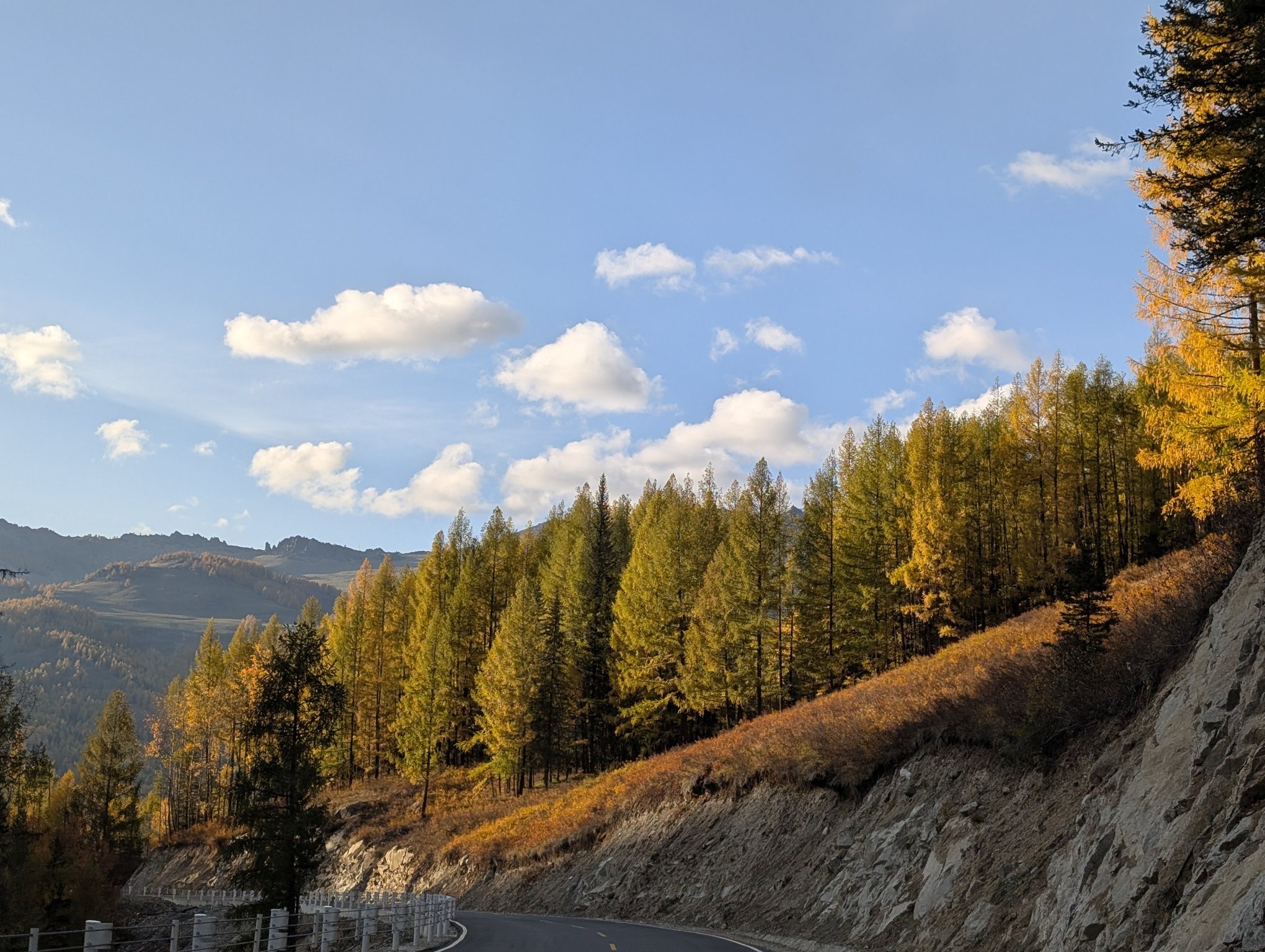 下午四点多出发回喀纳斯。中午时分开始已经放晴,有蓝天了。去景区的路上每个停车点都有人在那看着,当你靠近停下车,他们就会过来问你停多久。我一问说是有大领导要来检查,看来 70 周年实属隆重。他们还带着垃圾袋深入公路两侧的草地里捡垃圾,平日的公路哪有这般待遇。从景区方向开出来的车都是一队一队过来,每队前面都有警车带路,不用说也是限流了。
