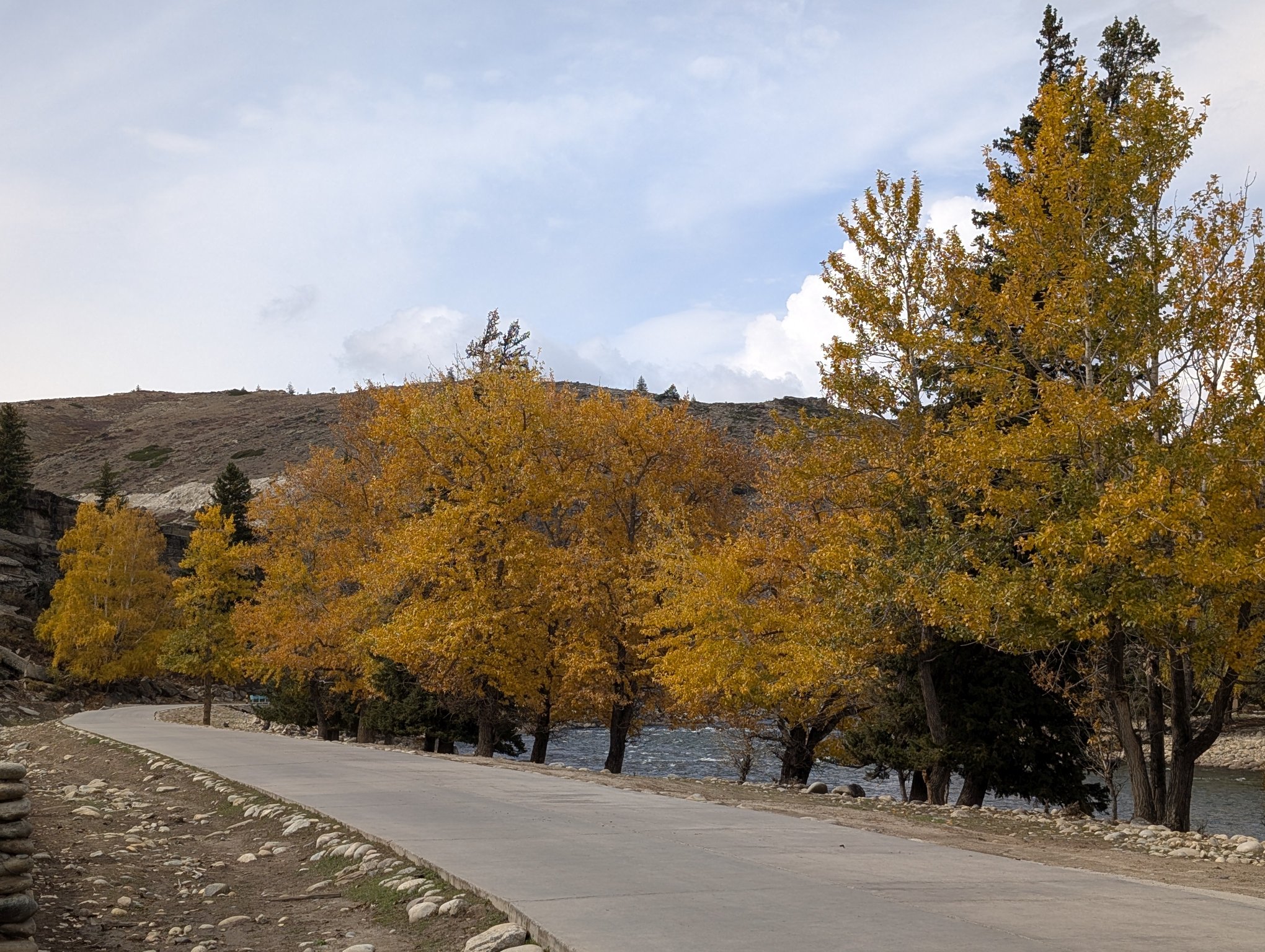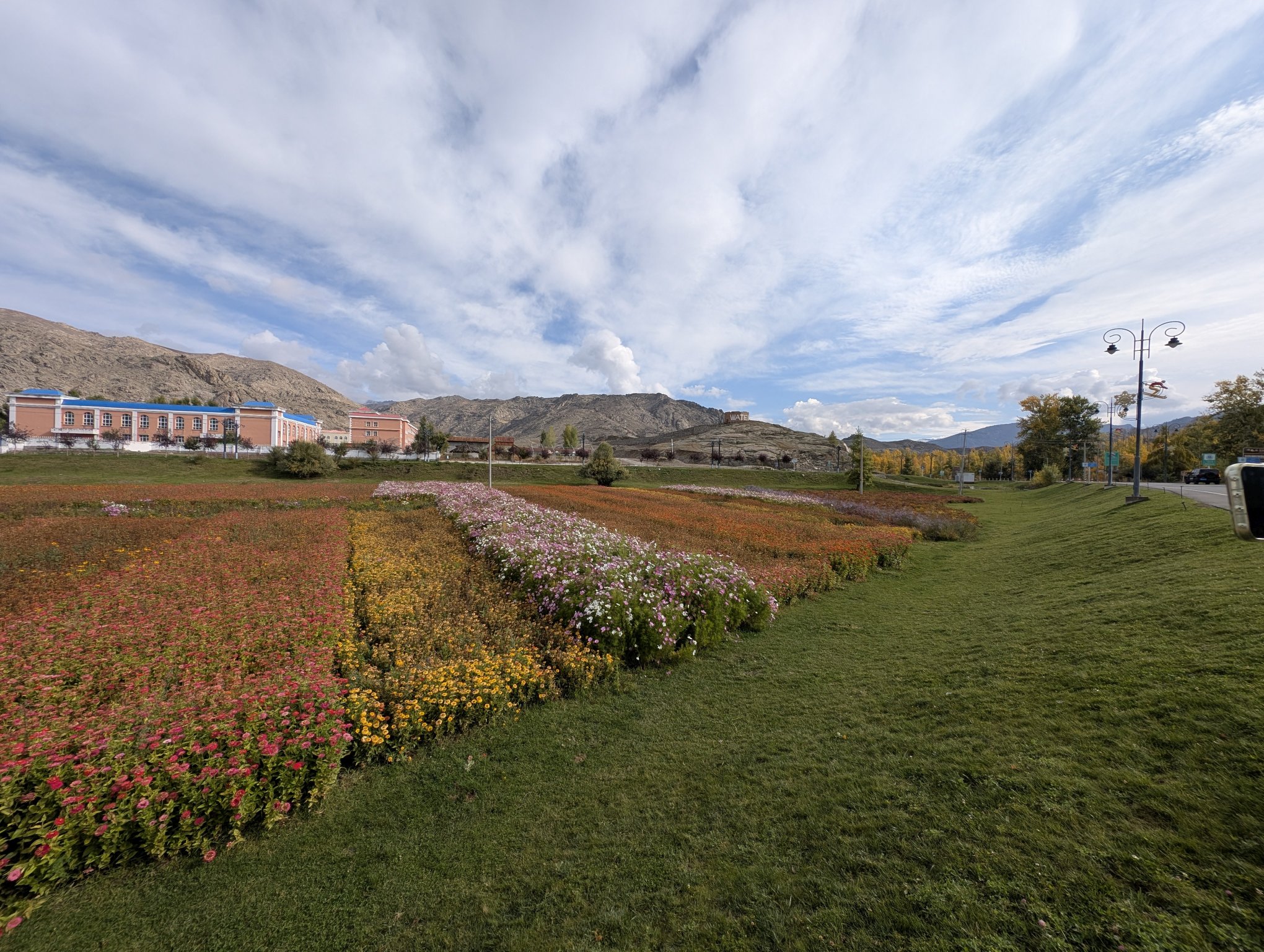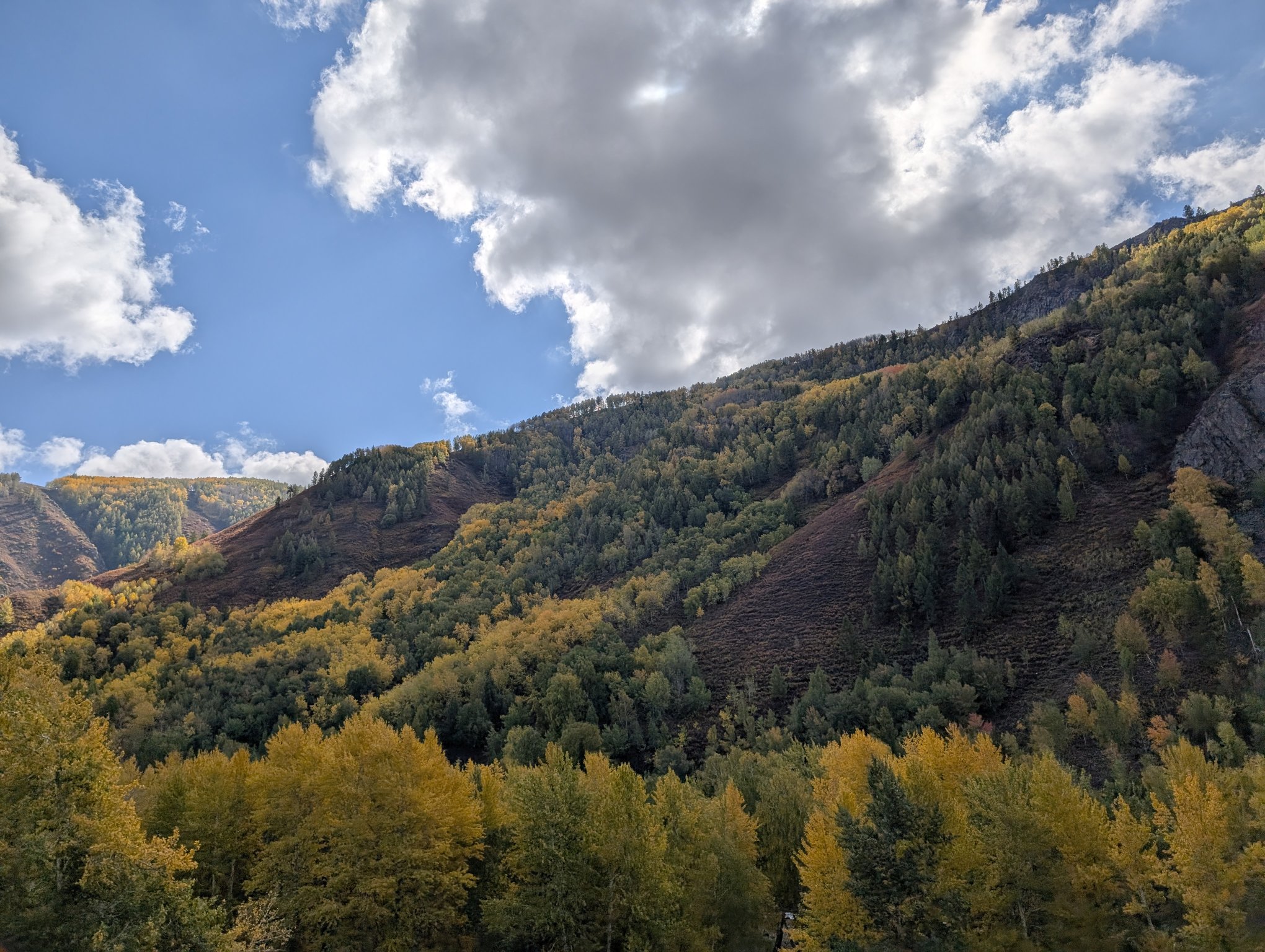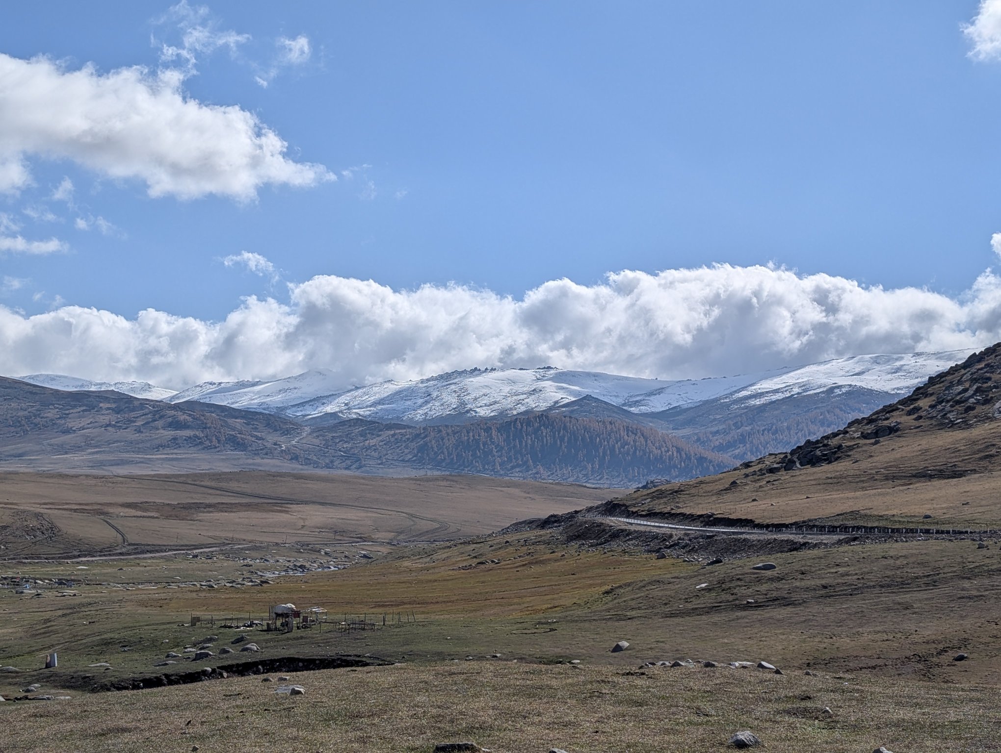 下午四点多出发回喀纳斯。中午时分开始已经放晴,有蓝天了。去景区的路上每个停车点都有人在那看着,当你靠近停下车,他们就会过来问你停多久。我一问说是有大领导要来检查,看来 70 周年实属隆重。他们还带着垃圾袋深入公路两侧的草地里捡垃圾,平日的公路哪有这般待遇。从景区方向开出来的车都是一队一队过来,每队前面都有警车带路,不用说也是限流了。