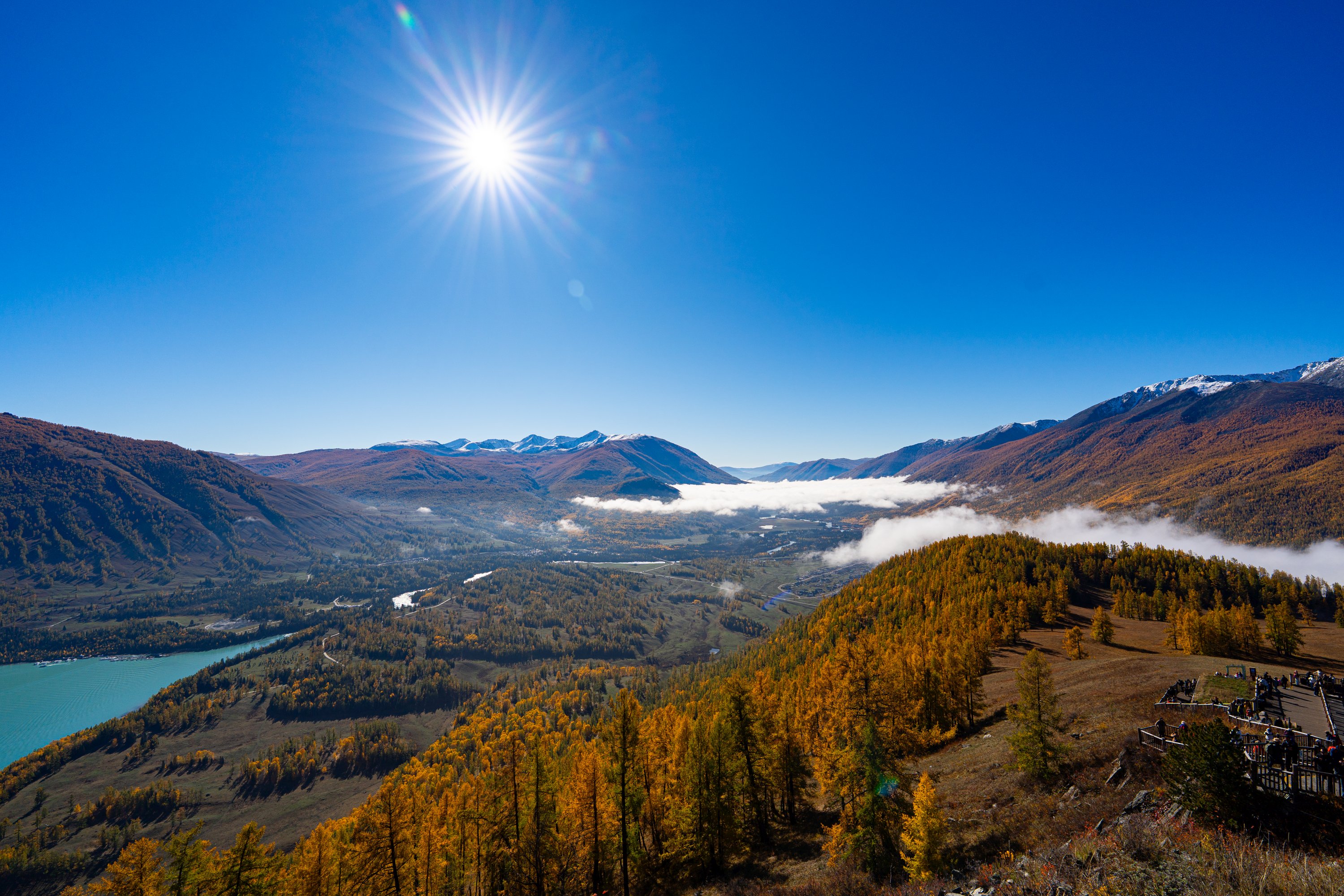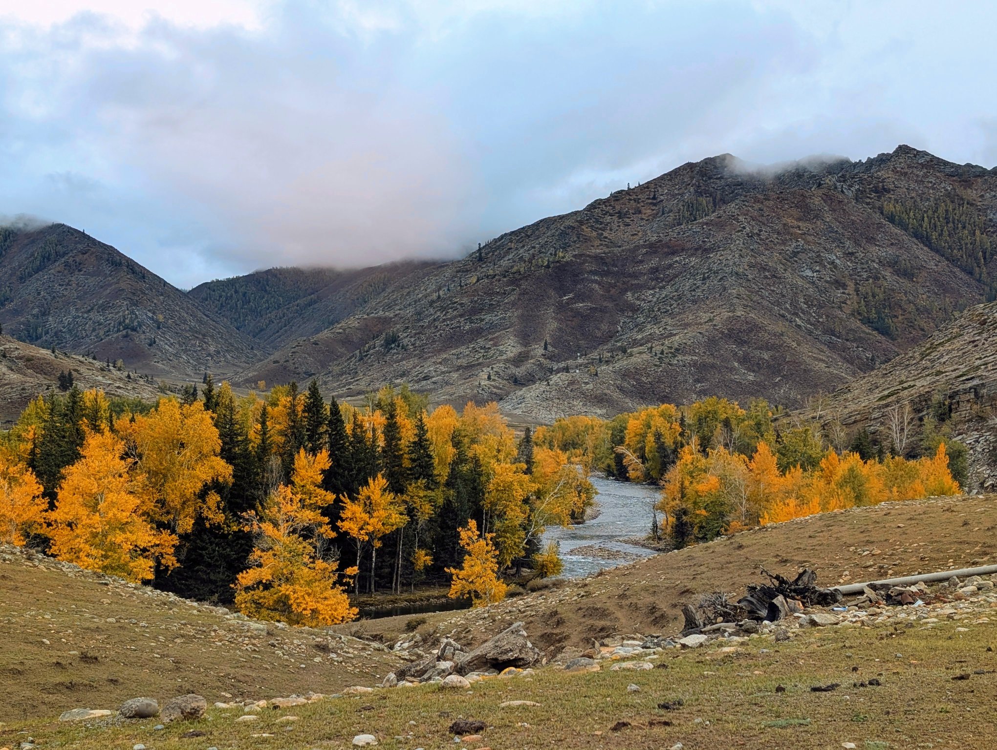 今天也是早起,冷飕飕的。早餐是服务中心买的鸡蛋,同时也买了景区的门票。终于要去喀纳斯景区了,今天的天气自然是艳阳高照,山里早上还弥漫着水汽,但等到太阳出来后很快就会散去了。