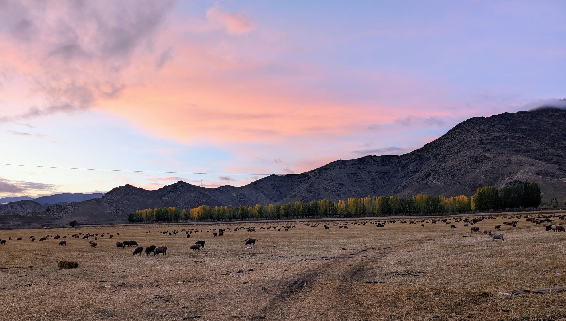 赶早出景区的原因还有一个,接下来要开车出发去阿勒泰市。这高德抽风,我明明选了走五大高速的路,开着开着就给我往 G331 上导,我说怎么越开时间越久了。不过拜它所赐,开到可可托海水库这边,看了一段羊羊吃草,蹲在一旁泥地地拍了一段,顺便看看日落。