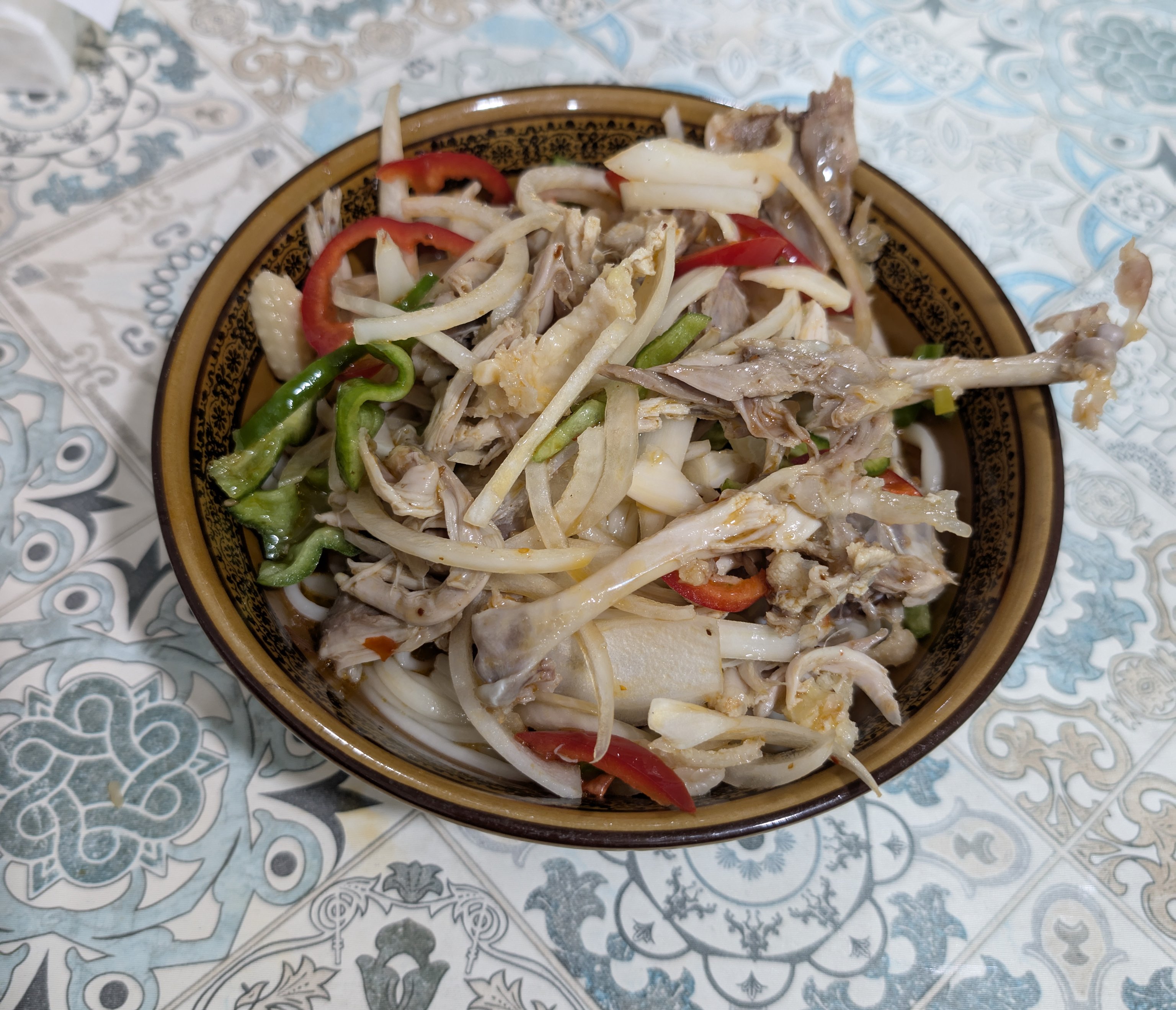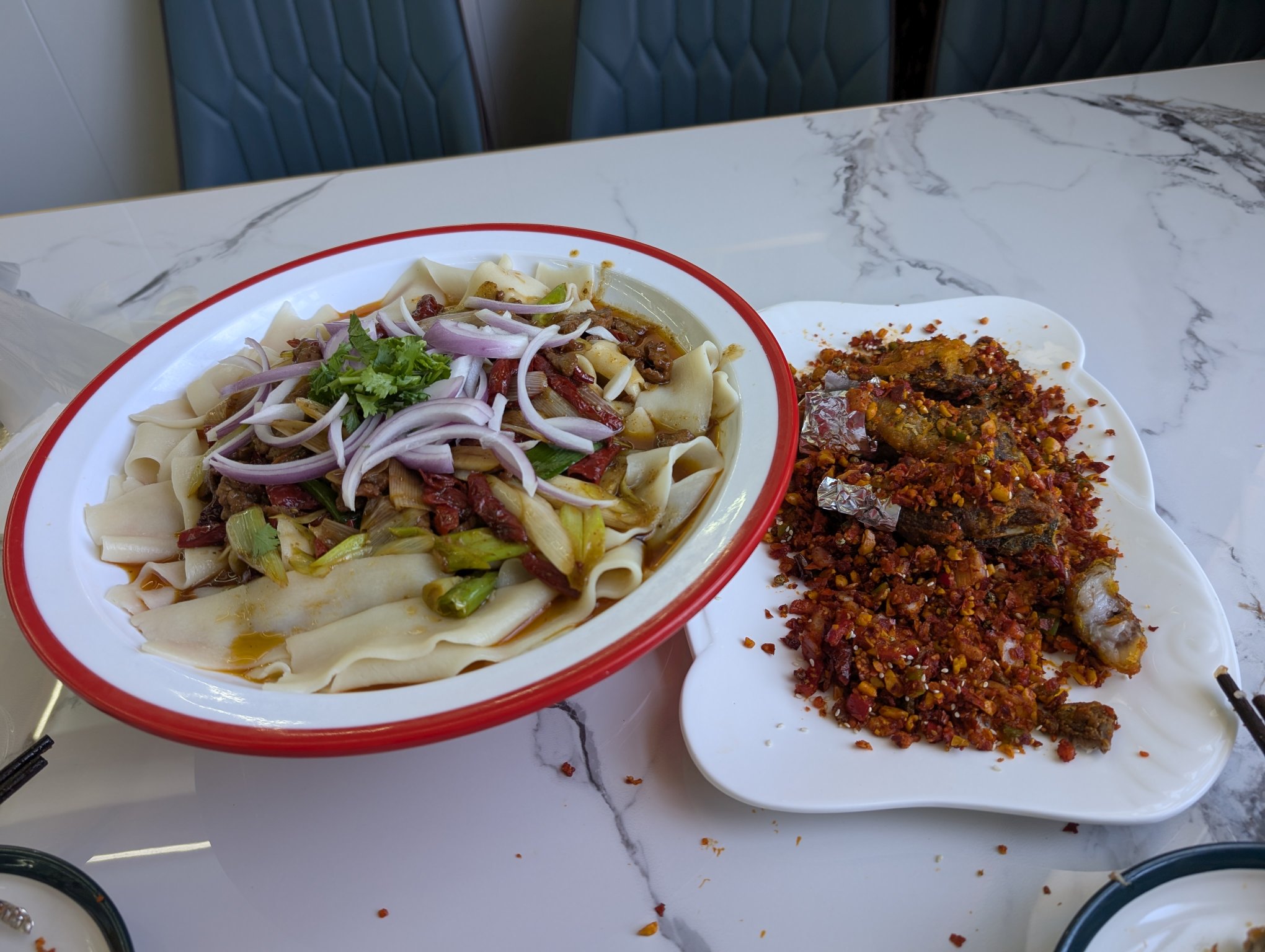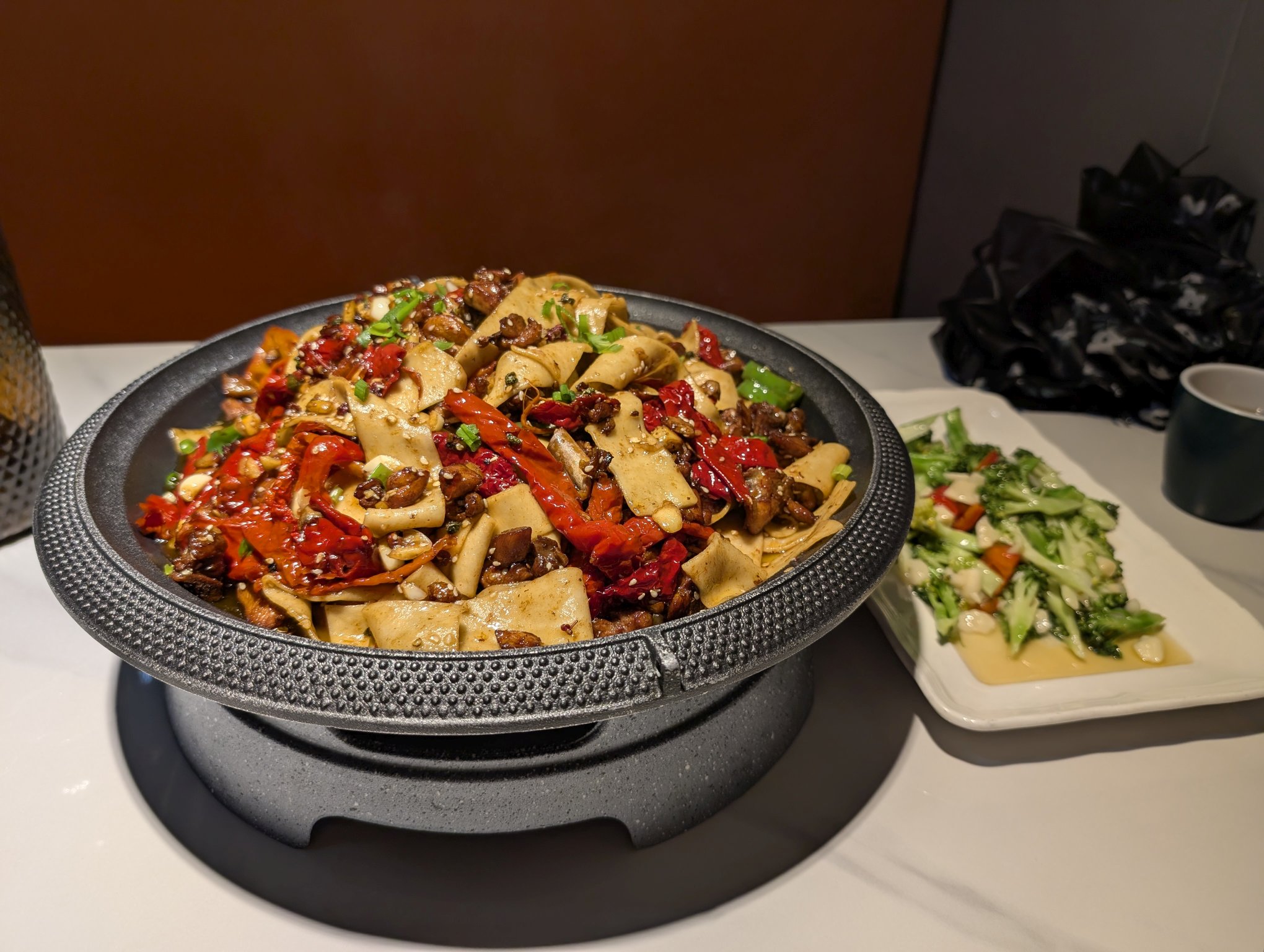到了布尔津后点了辣子鸡炒面,又点了一份西兰花换换口味。