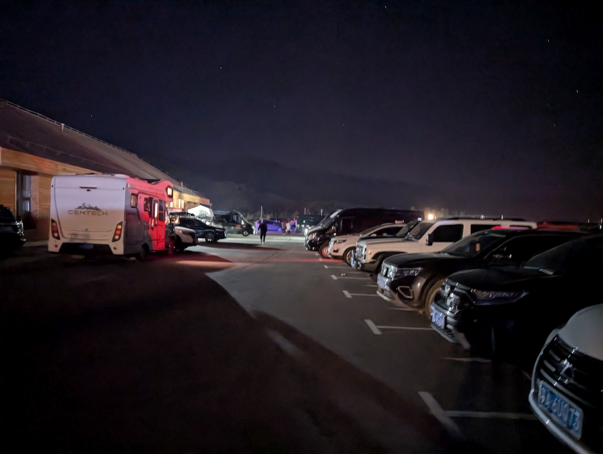 停车场很大,里面停满了大大小小的车。十点钟左右大部分车已经是熄灯状态,但经过时还是能看到车内有人活动,看来有不少人跟我们一样是做好过夜准备的。