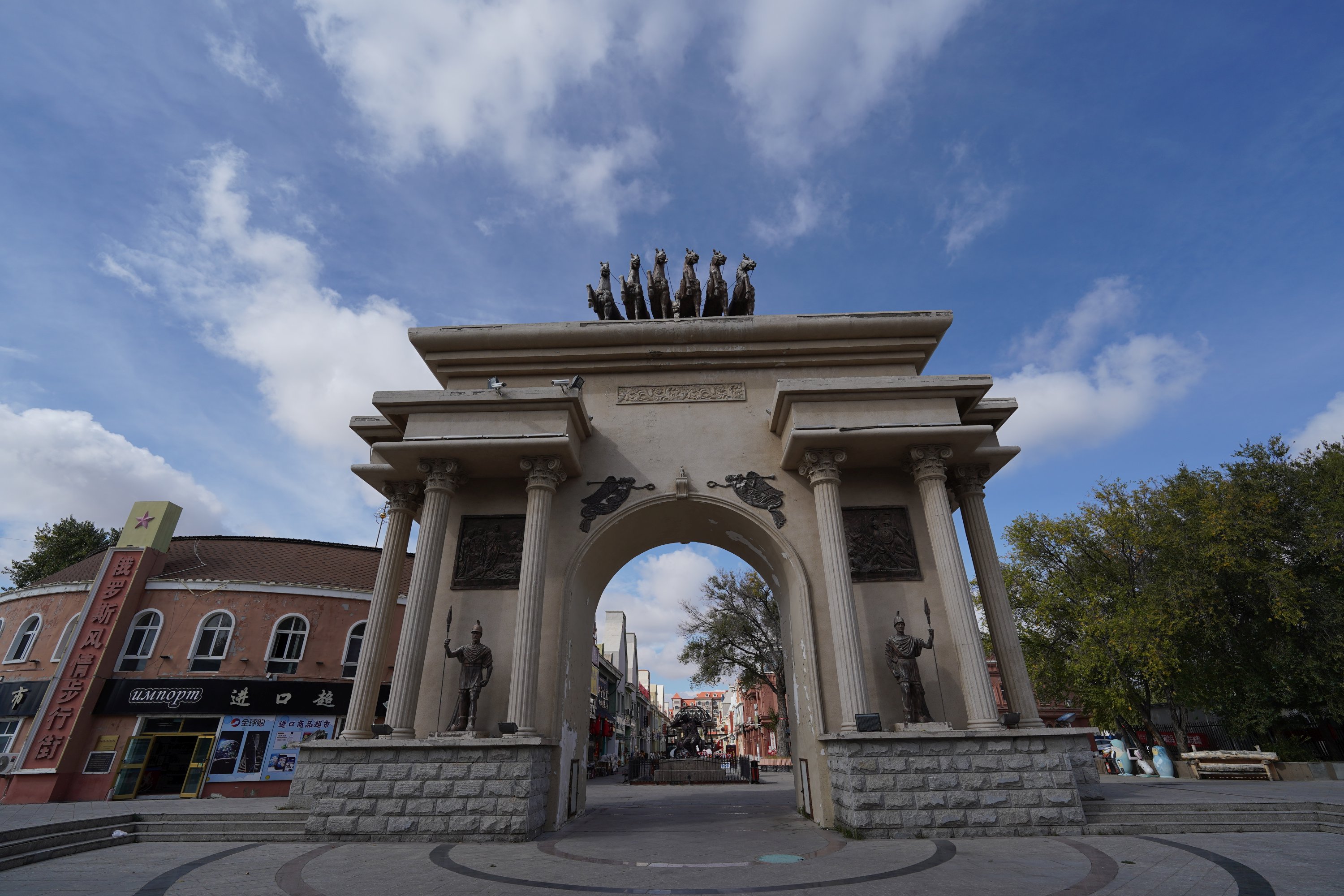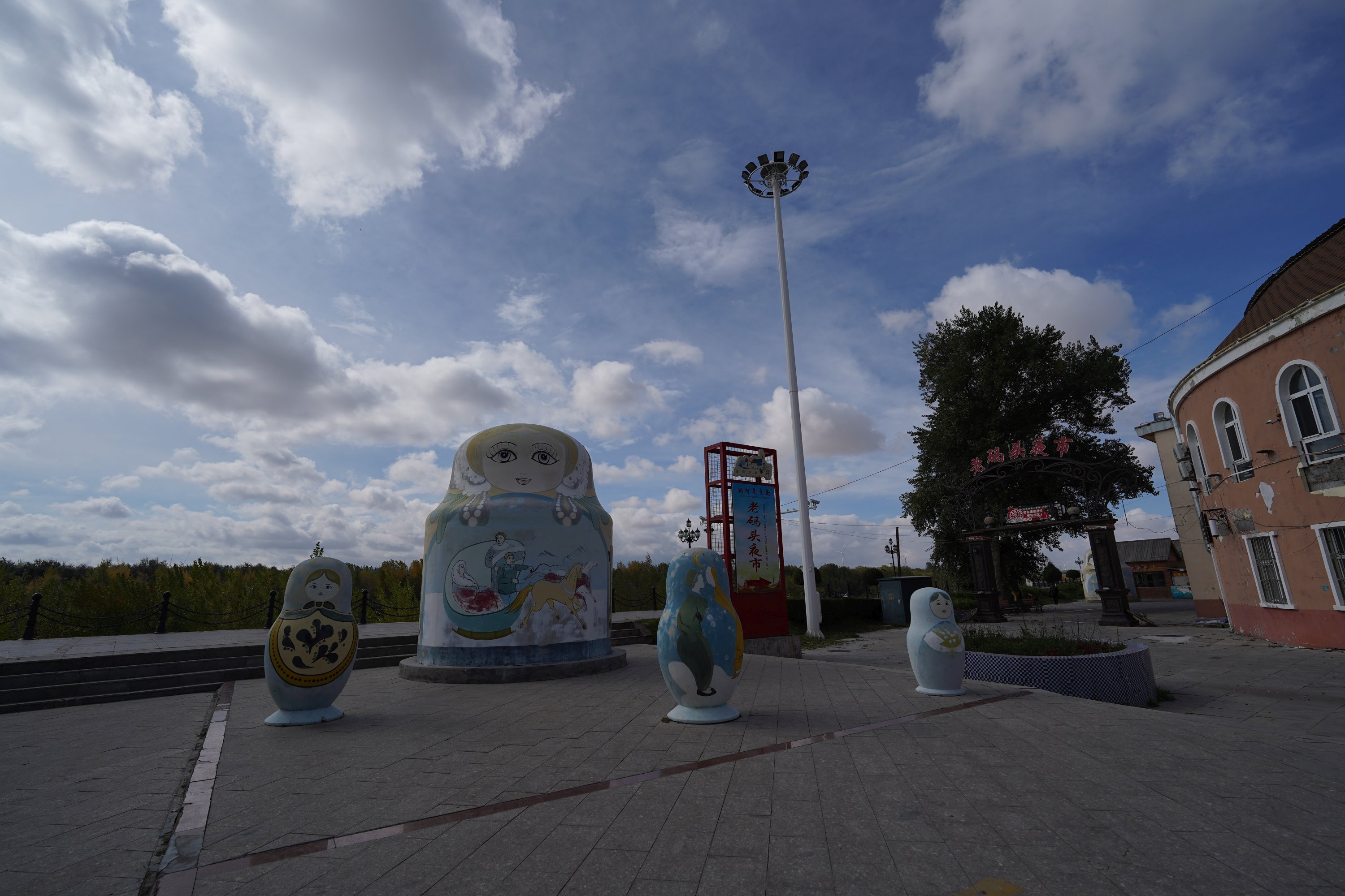 吃完再去喀纳斯塔桥,用无人机航拍一下白天的风景。布尔津远离了山区,放晴地比较早,中午太阳已经有点露脸了。拍完大桥后再去中俄风情街逛逛。