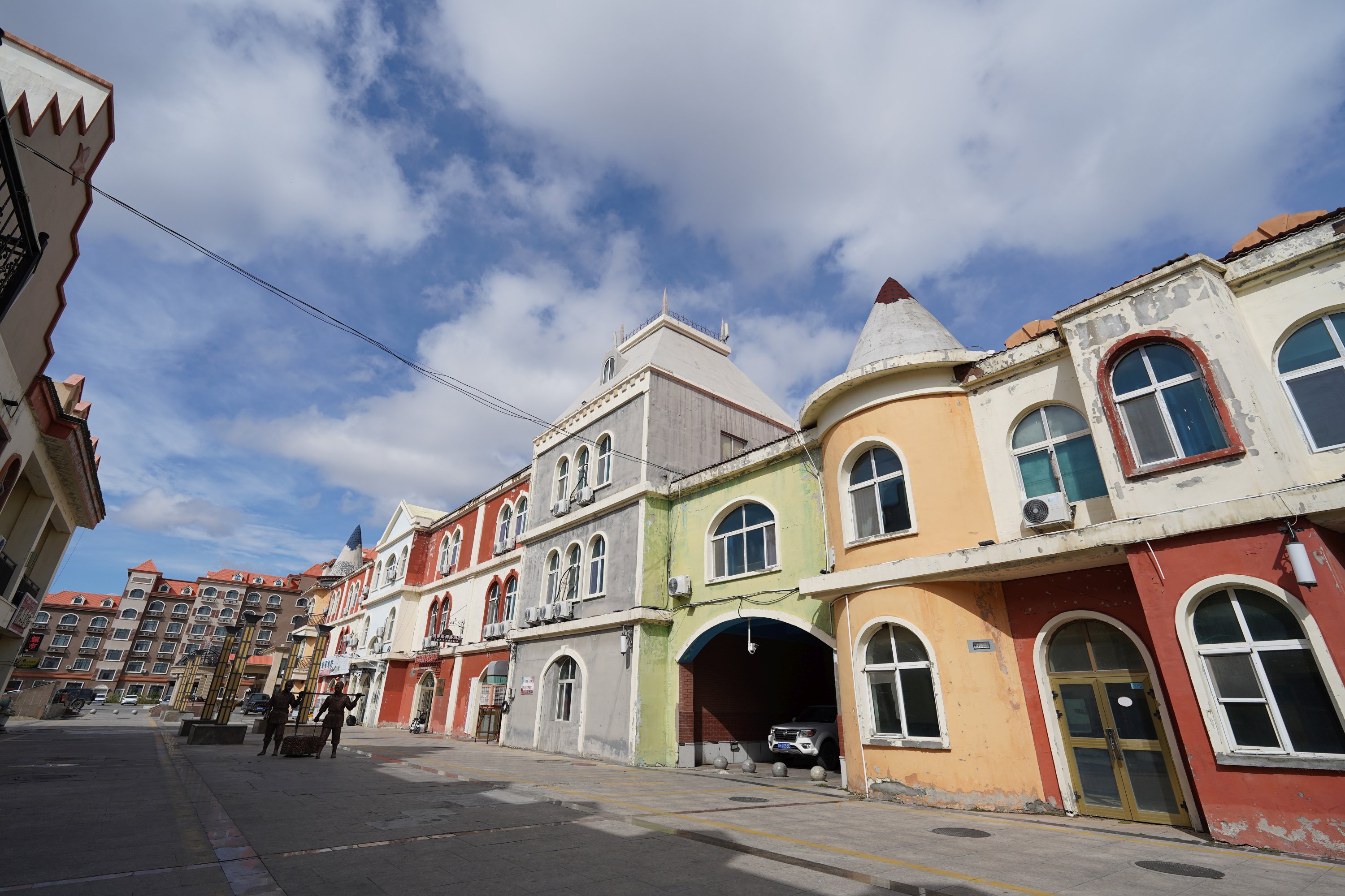 可能因为今天是工作日的白天,这里一片冷清景象,很多店铺都关着。五颜六色的花墙,虽然今天看已经比较斑驳,甚至有些已经剥落,但还能看出昔日风彩,俄罗斯 18 世纪宫庭建筑和街道上的童话人物雕塑交映生辉。