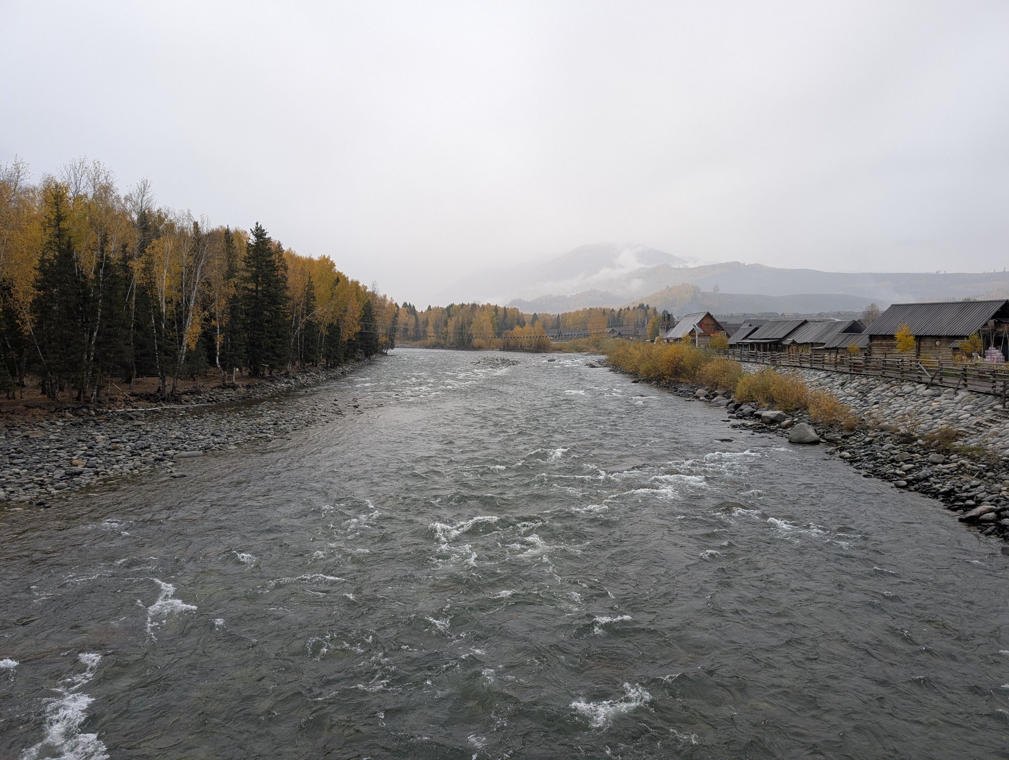 在村里各个景点选了选,决定还是爬一爬巴登观景平台,在那里俯瞰风景。去巴登观景平台要经过村里的禾木桥,禾木桥下是禾木河。因为下雨桥上比较泥泞,隐约还有屎味,应该是屯了不少马粪。平台上也是烟雨缭绕的禾木乡,饱饱眼福。之后再从观景台下来,冒雨回到桥头站,其他景点实在不想去了,于是坐 1 号线出村。