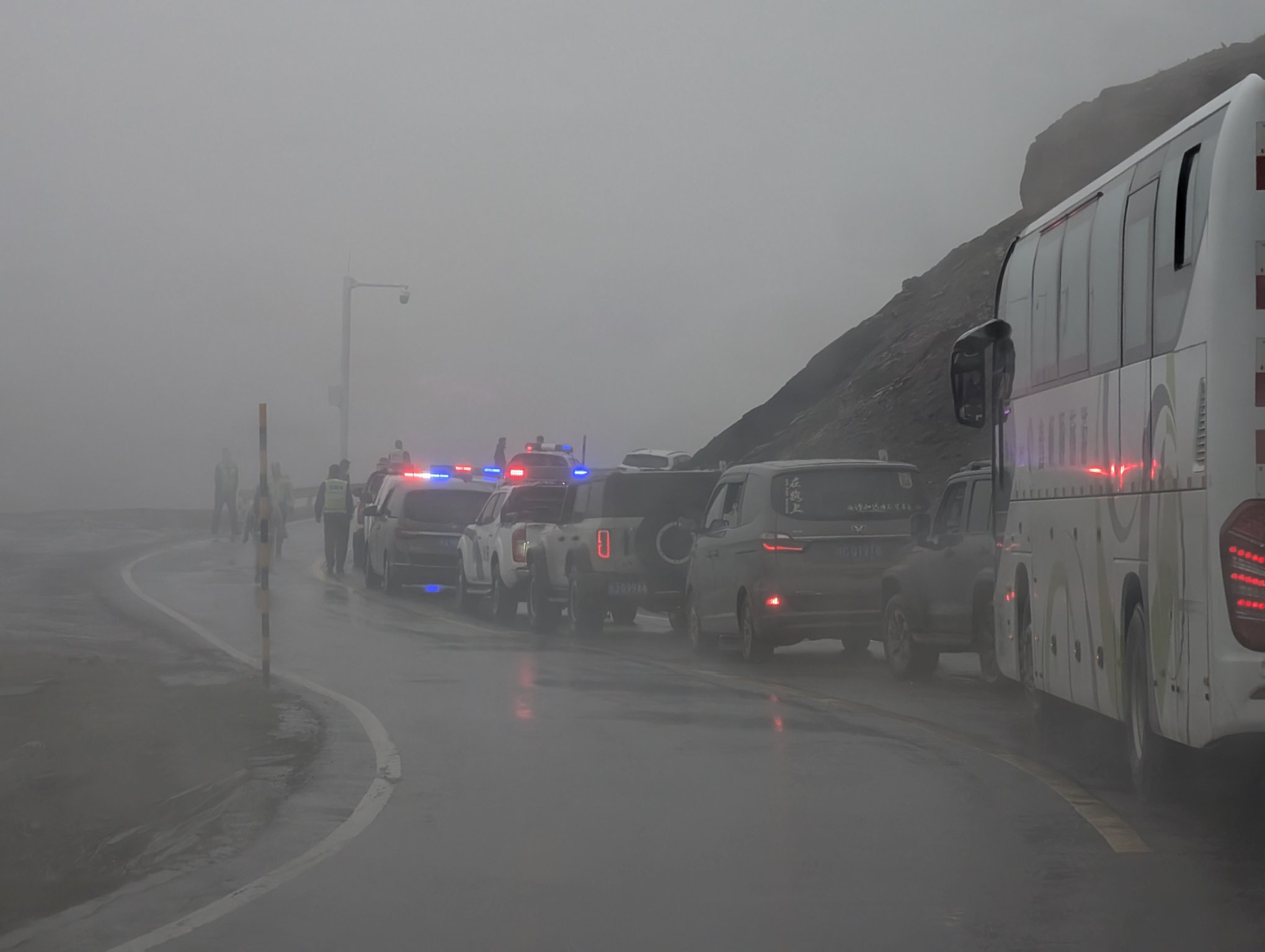 雨还在下。我们按原定计划开车前往喀纳斯景区。要沿 S232 省道开一个半小时,不过此时路上车超多。走走停停,堵起来了。