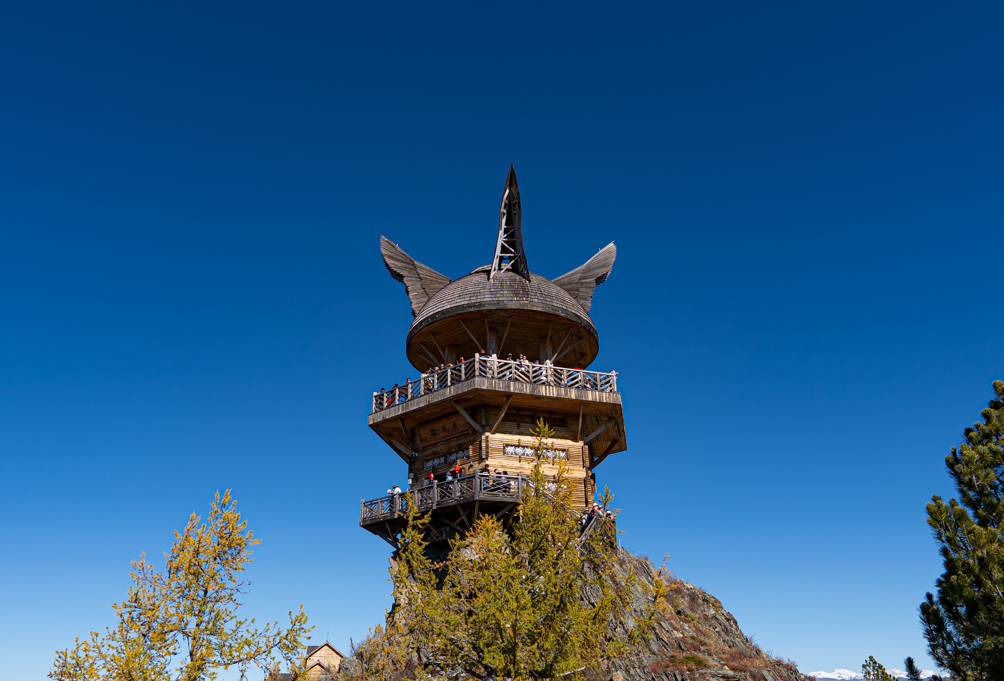 推荐游览路线就是先去观鱼台俯瞰喀纳斯景区和喀纳斯湖,接着有时间可以去湖边游玩,然后回程再去三湾。所以接下来坐 2 号线去观鱼台,听说观鱼台人多了会限流,所以早点去比较好。到了观鱼台以后下车步行登山,有 1068 级台阶。我们爬的时候十一点多云雾才逐渐散去。在这之前山上还是雾蒙蒙的一片,看不清远处景色。