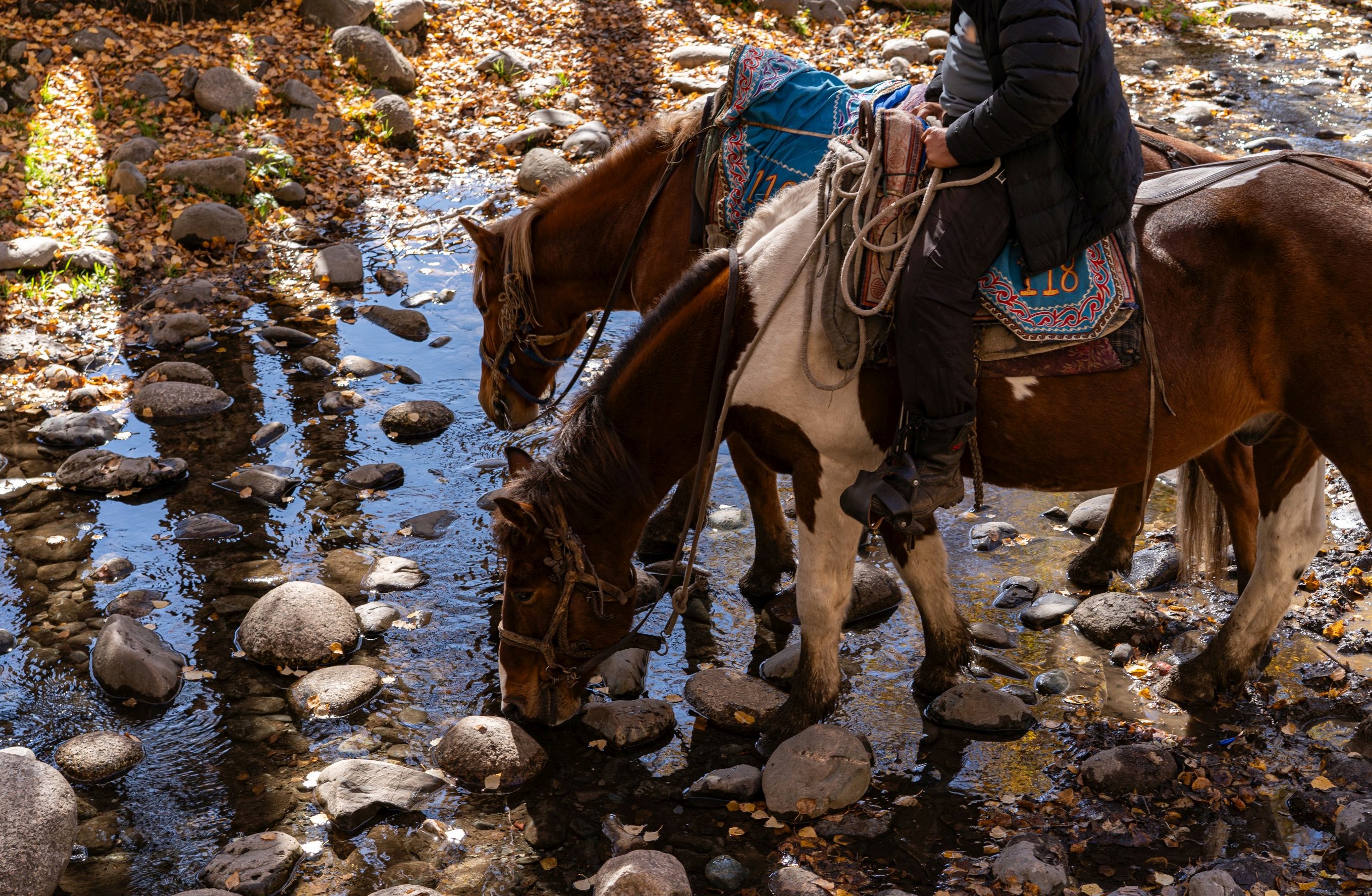在去的路上看到一个牧马场。原本我们的计划是从景区回来返程时再骑马的,现在只是去问问价。一问 120 每人,心想这价格也不会贵得离谱,不如赶巧了索性现在就骑。于是让老板牵了马出来。听我们是头一回骑马,老板自己也骑上马带着我们。
