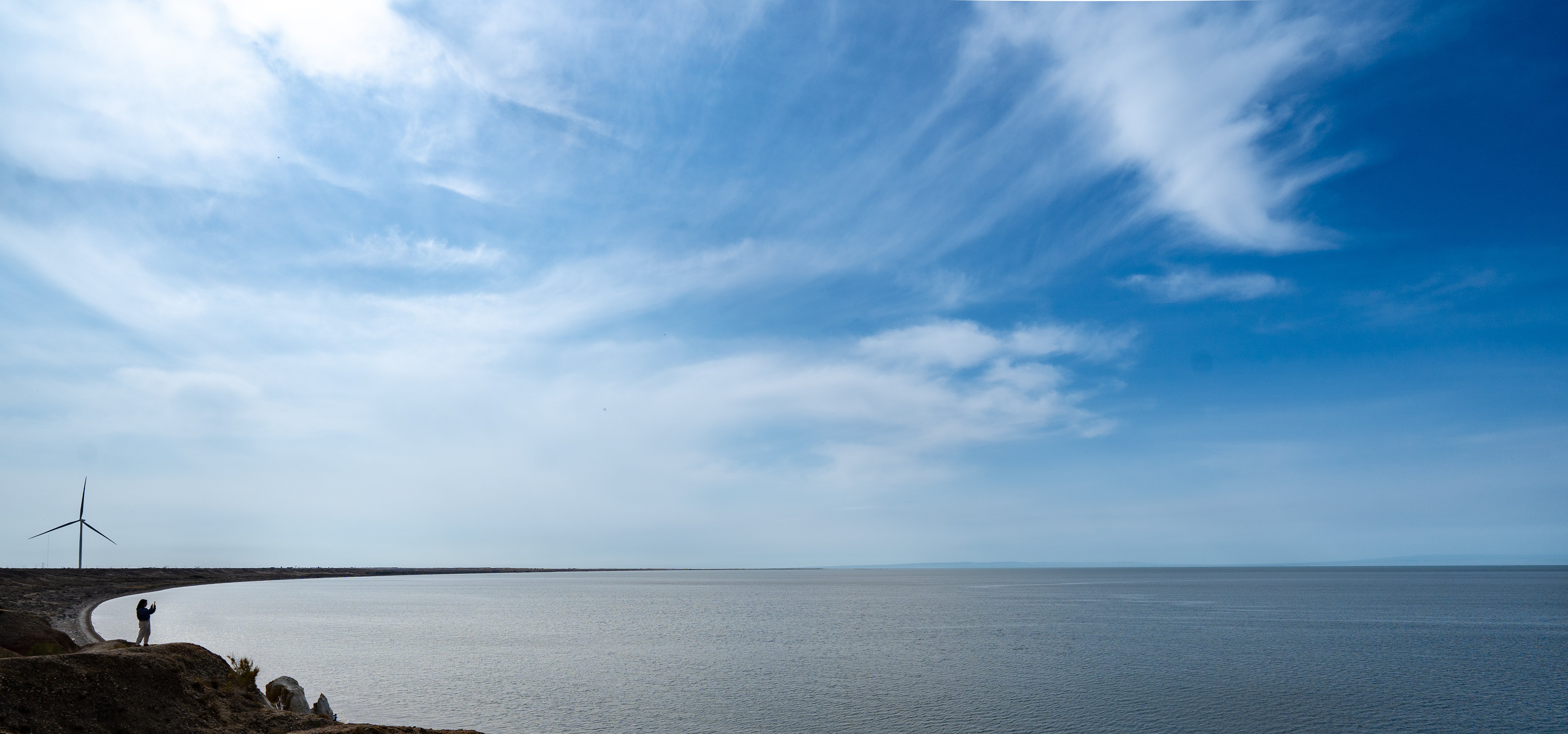 乌伦古湖在阿勒泰地区福海县,准噶尔盆地北部。乌伦古河的河水先注入吉力湖,再注入乌伦古湖,是乌伦古河的尾闾湖。乌伦古湖作为整个水系的终点,没有出口,水分通过强烈的蒸发进入大气,而盐分则被不断浓缩,最终形成了微咸水湖的状态。