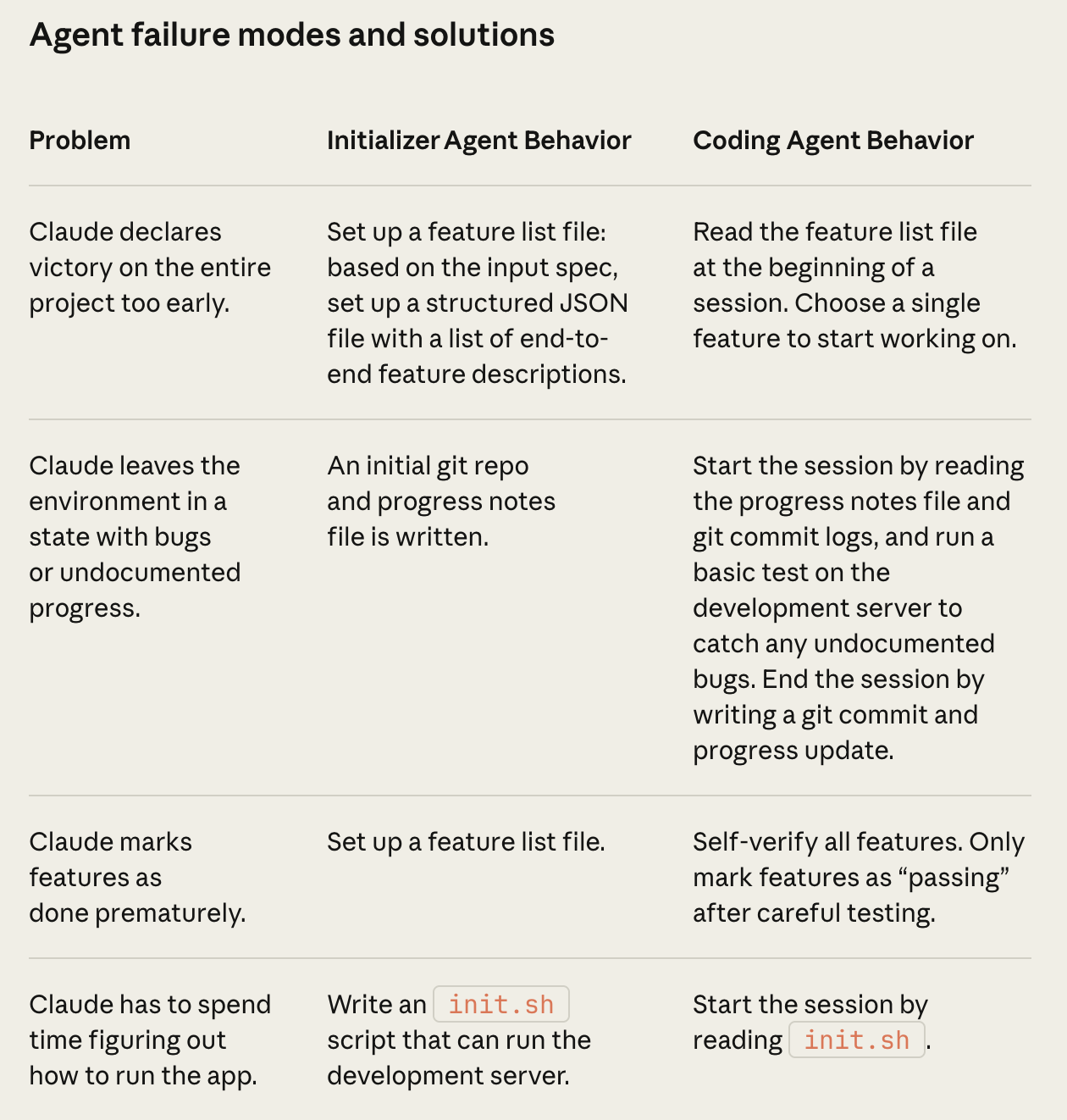 该解决方案包括两个部分:初始化代理(initializer agent)和编码代理(coding agent)。初始化代理在首次运行时设置环境,包括创建初始化脚本、进度日志文件和初始 Git 提交。编码代理则在每次会话中负责逐步推进项目进度,并在结束时留下清晰的进度记录。