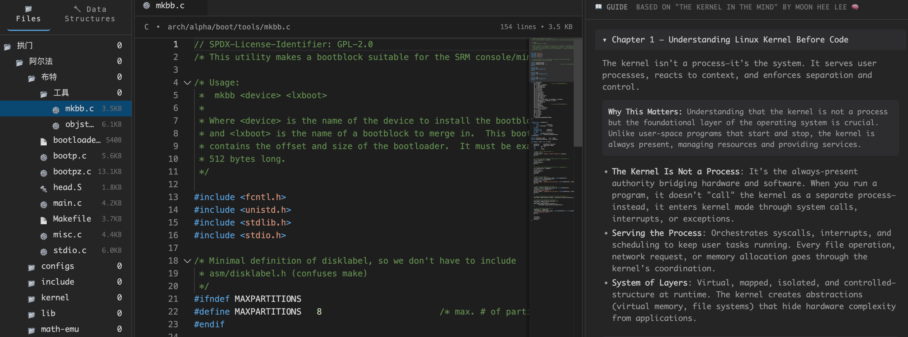 一个用于探索 Linux 内核代码的在线工具,旨在帮助用户更好地理解和学习 Linux 内核的结构和功能。它通过提供一个交互式的界面,让用户可以浏览内核代码,并配有基于“Kernel in the Mind”一文的指导。