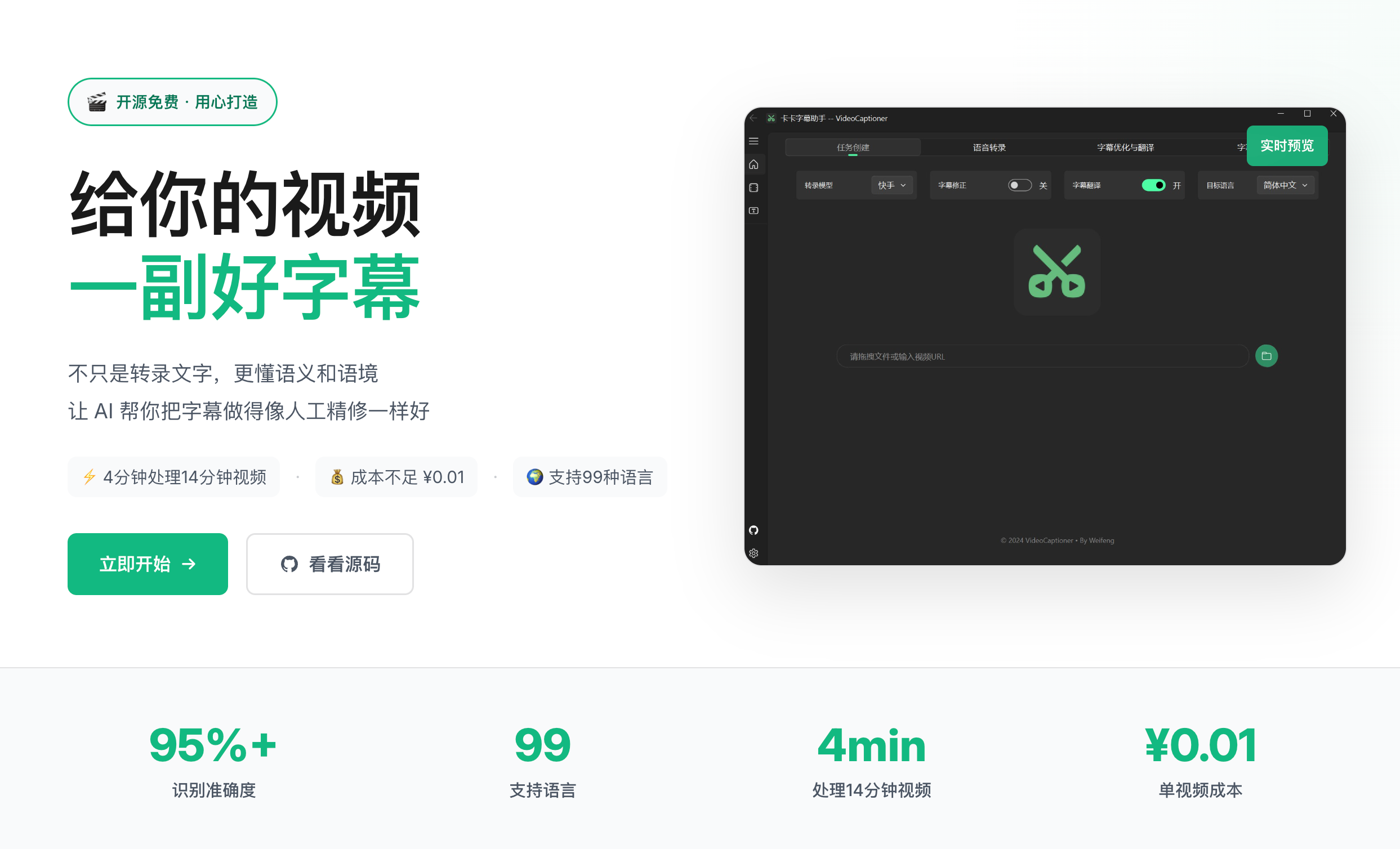 VideoCaptioner 是一款基于大语言模型(LLM)的视频字幕处理工具,支持语音识别、字幕断句、优化、翻译全流程处理。