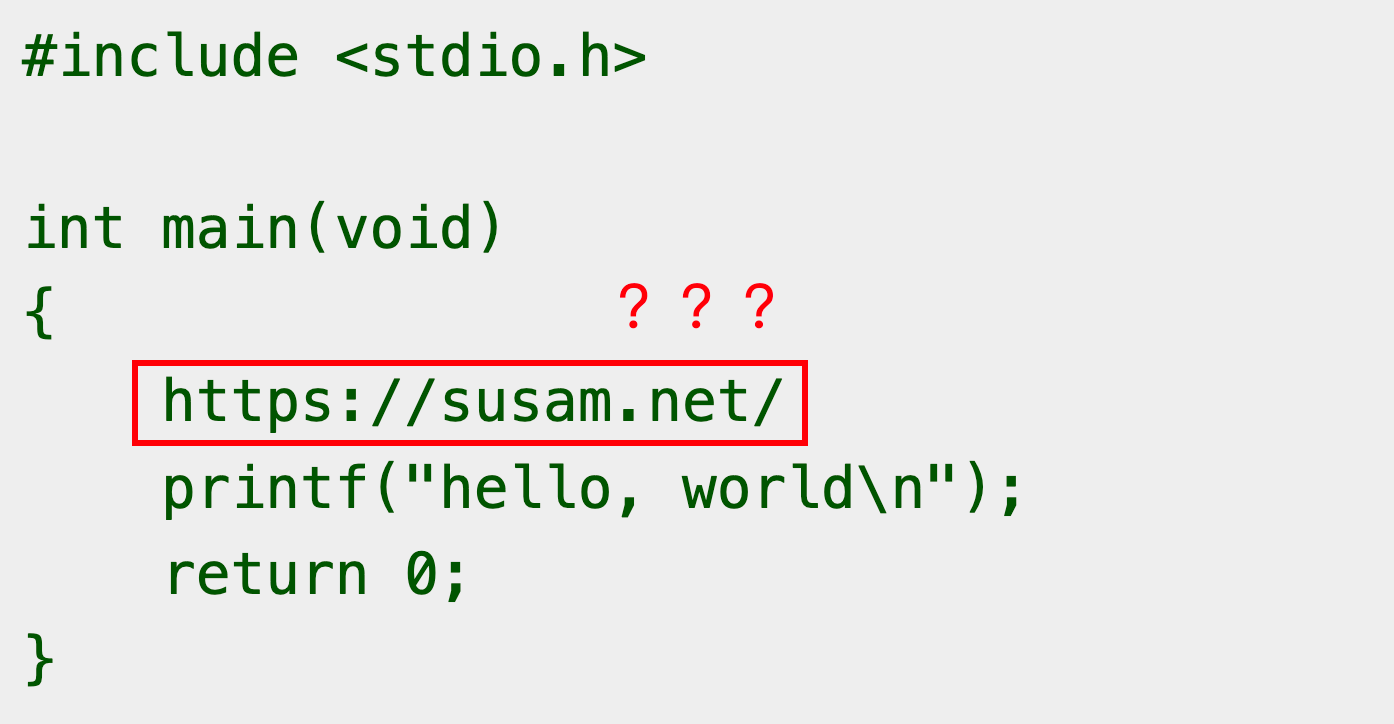 原因是在C99标准下,URL可被巧妙利用为代码的一部分。代码中 https://susam.net的https:被解释为了一个标签(label),随后的//是注释标识,直至下一行。