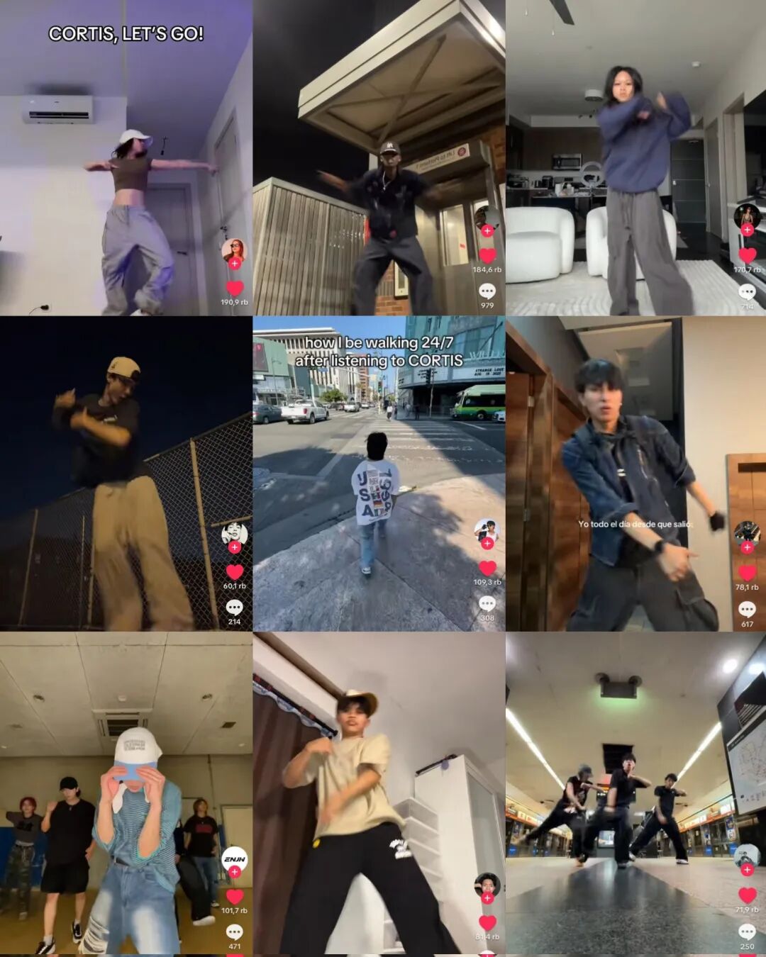 因此,歌曲越来越短、重复性越来越强的洗脑旋律与歌词、简单易上手的编舞也逐渐成为流行。比如在发行一个月后,CORTIS的先行曲《GO!》仍然在TiikTok爆红的舞蹈Challenge便是如此。在“GO,GO,GO”的节奏驱使下,该舞蹈动作也被拆解为适配各类场景的抽象表达。