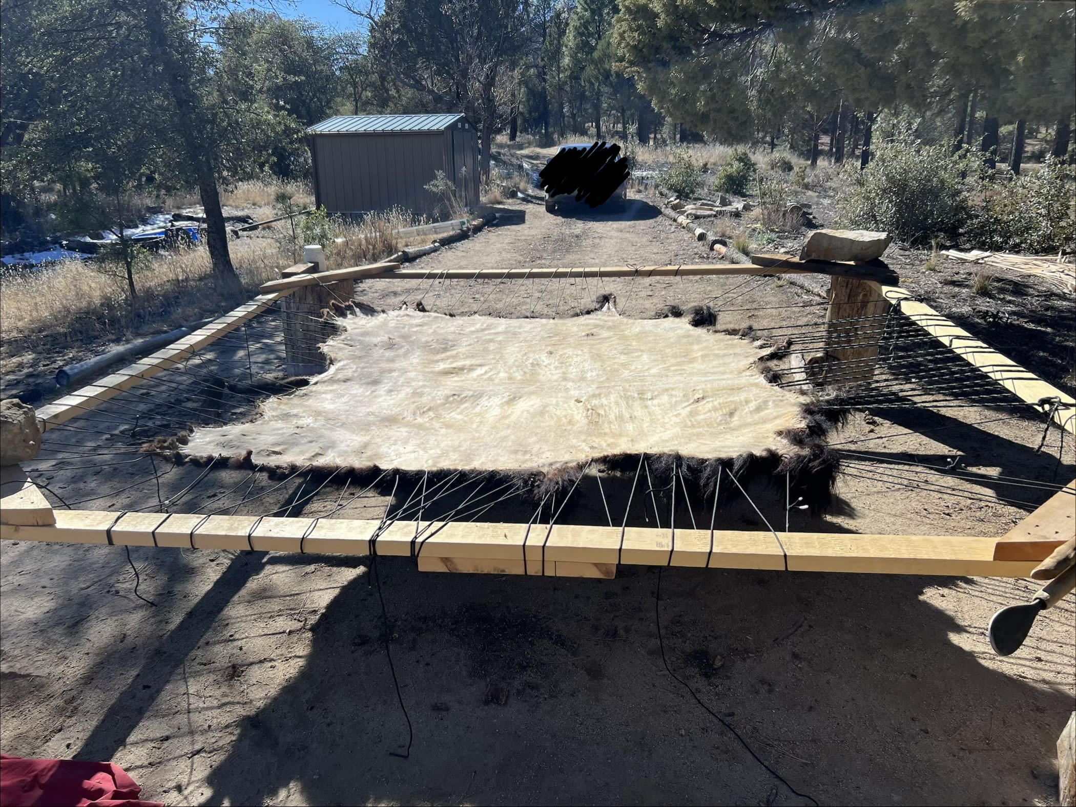 Before it could be turned into the world’s coziest sleeping bag, the rawhide had to be softened. It was stretched in a wooden frame, weighed down, scraped, and treated with a softener. Traditional methods include tannin from tree bark and animal brain. My friends worked with egg yolk. I found them crawling on all fours, on the hide, hands and feet smeared in egg slime. I picked up a scraper and helped work the thick hide.