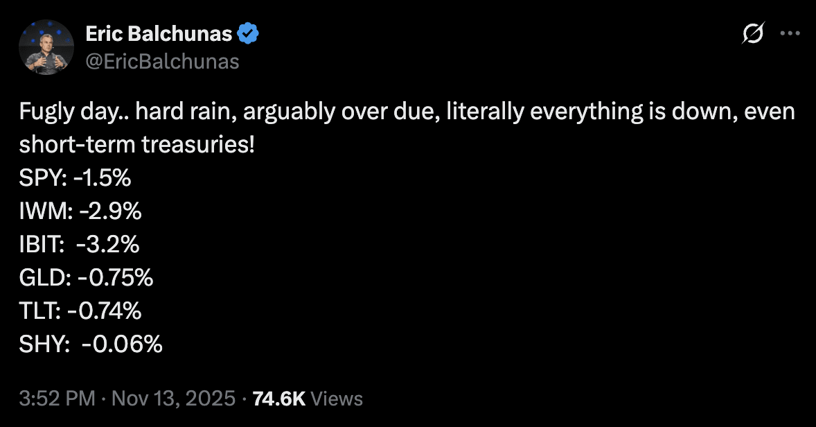 Yesterday was a rough one in financial markets. Tech stocks, bitcoin, and many other investment assets were caught in a sea of red. It seemed like nothing could hide from the pain. Bloomberg’s Eric Balchunas showed that everything was down, including short term Treasuries.