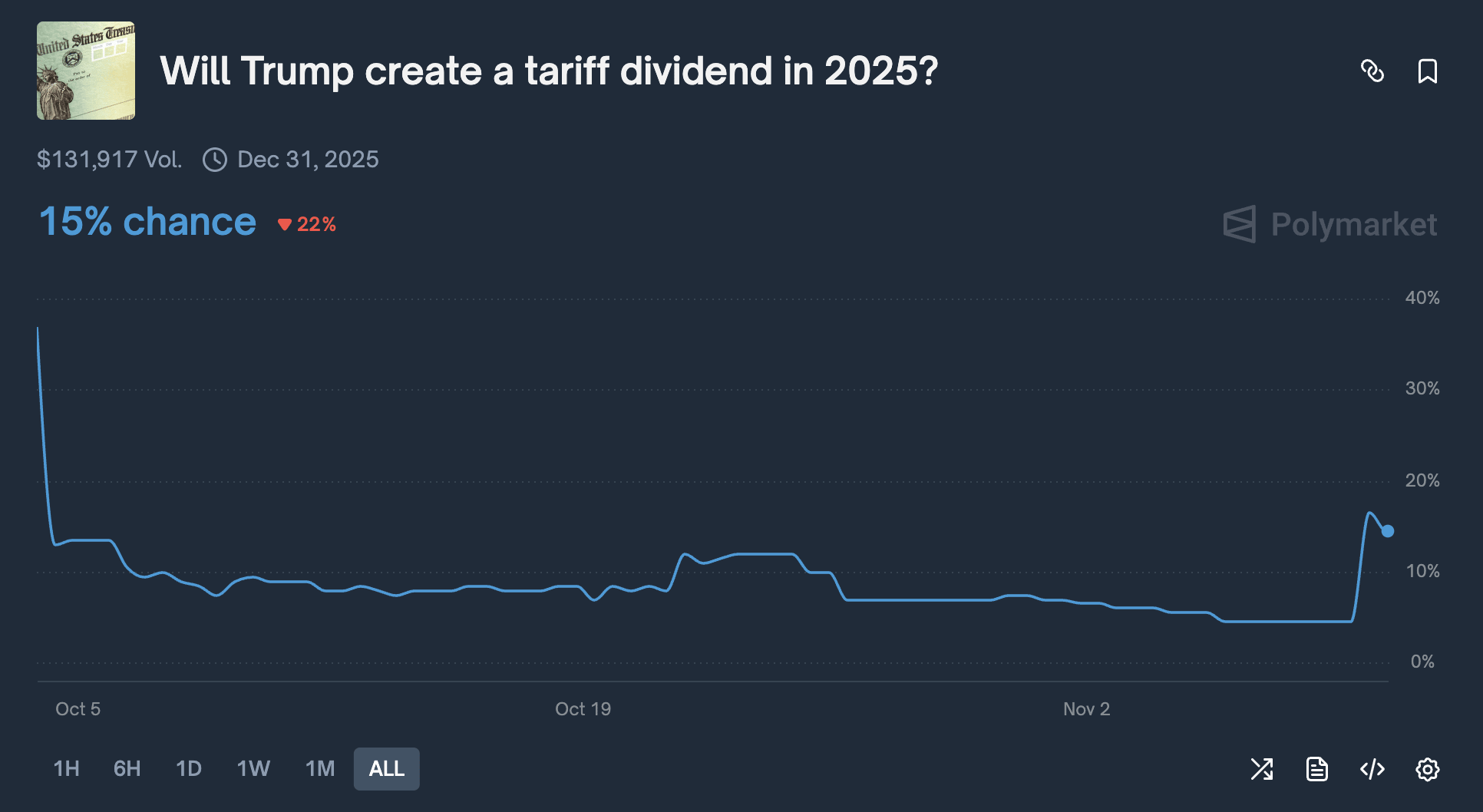 Now will the tariff dividends happen? I have no idea. Polymarket odds are only at 15% right now.