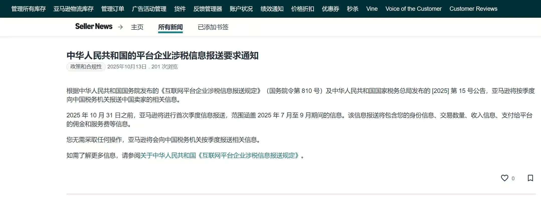亚马逊发布最新卖家通告,将在2025年10月31日之前,亚马逊将向中国税务部门报送中国卖家的相关交易、收入等信息。下面来自亚马逊的通知详细截图及文本内容。