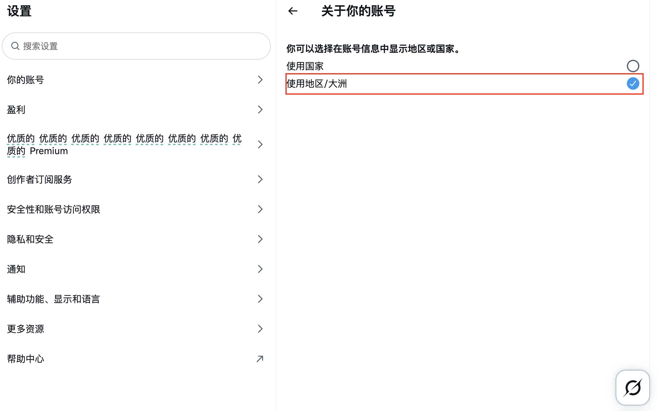 最近X(推特)开始在用户资料里面根据IP地址显示用户所在的国家。这是强制显示用户无法取消,但是X(推特)也提供了另一个方案,就是不显示国家,而是显示“洲”,例如亚洲、欧洲、大洋洲。