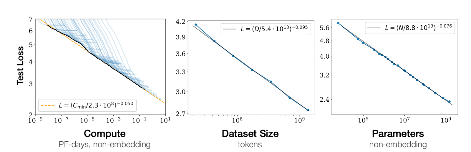 “Test loss” is a way to measure the mistakes that Large Language Models (LLMs) make.2 The lower, the better. What this is telling you is that predictions get linearly better as you add more orders of magnitude of compute, data, and parameters to an LLM. And we can predict how this will keep going, because it has remained valid over seven orders of magnitude!3
