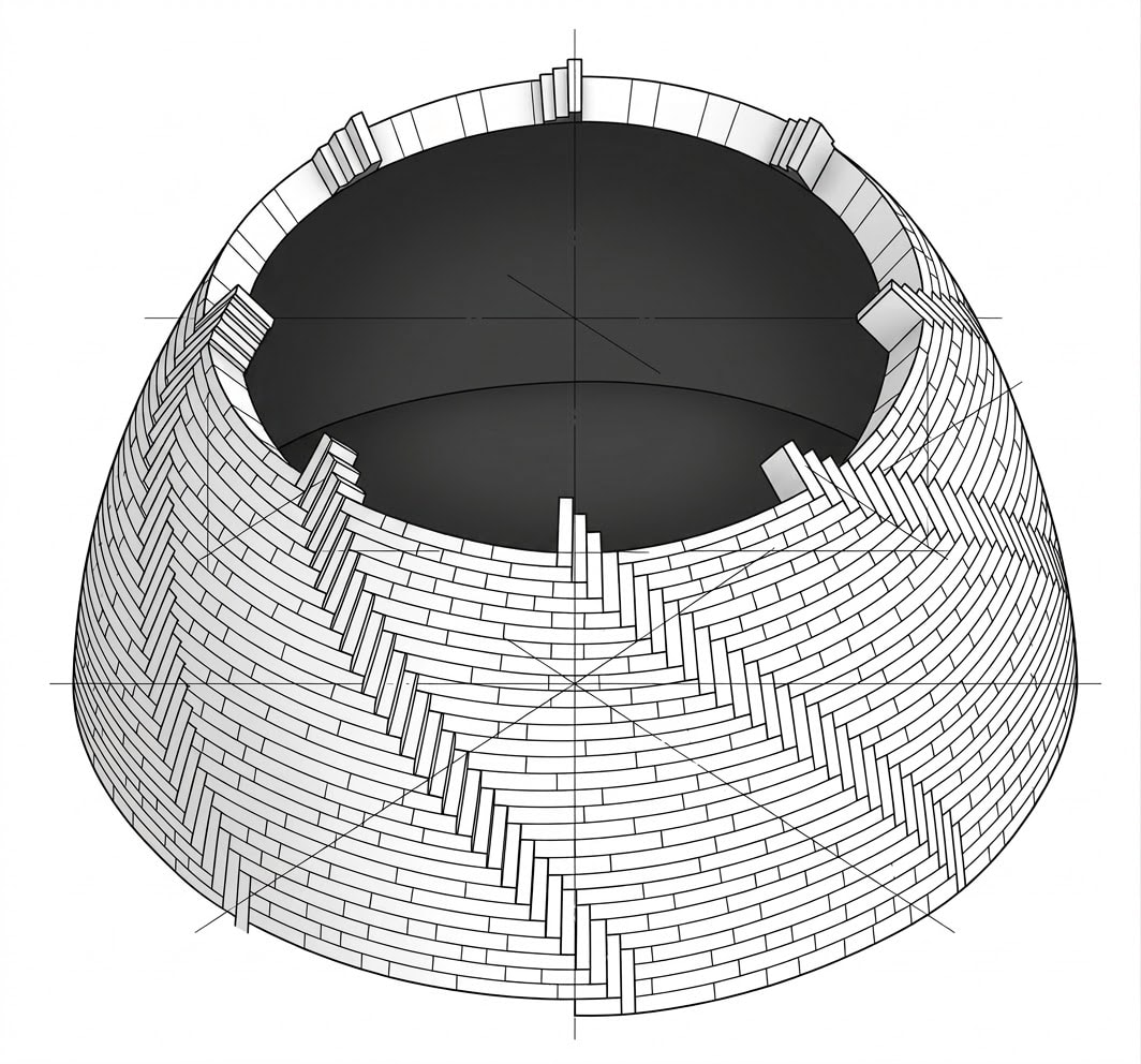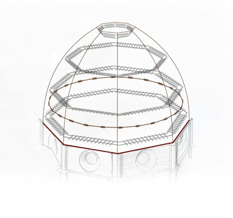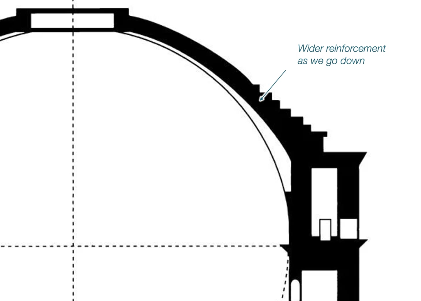 The key challenge was to prevent the dome from falling. The first thing there was to adopt the insight of Gothic architecture that taller arches are stronger than circular ones. So the dome is not a hemisphere, it’s a bit more vertical.