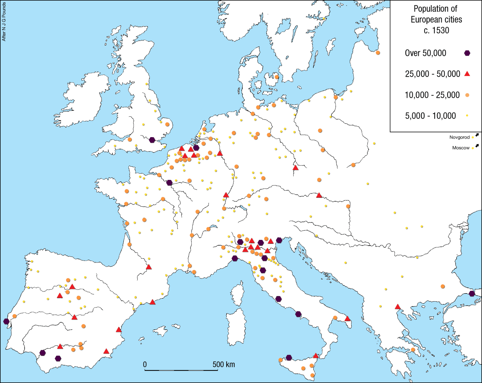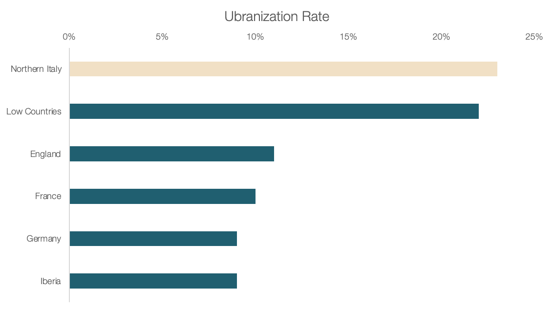 One of the main reasons was urbanization. These were the main European cities in the early 1500s. Notice how many are in northern Italy!