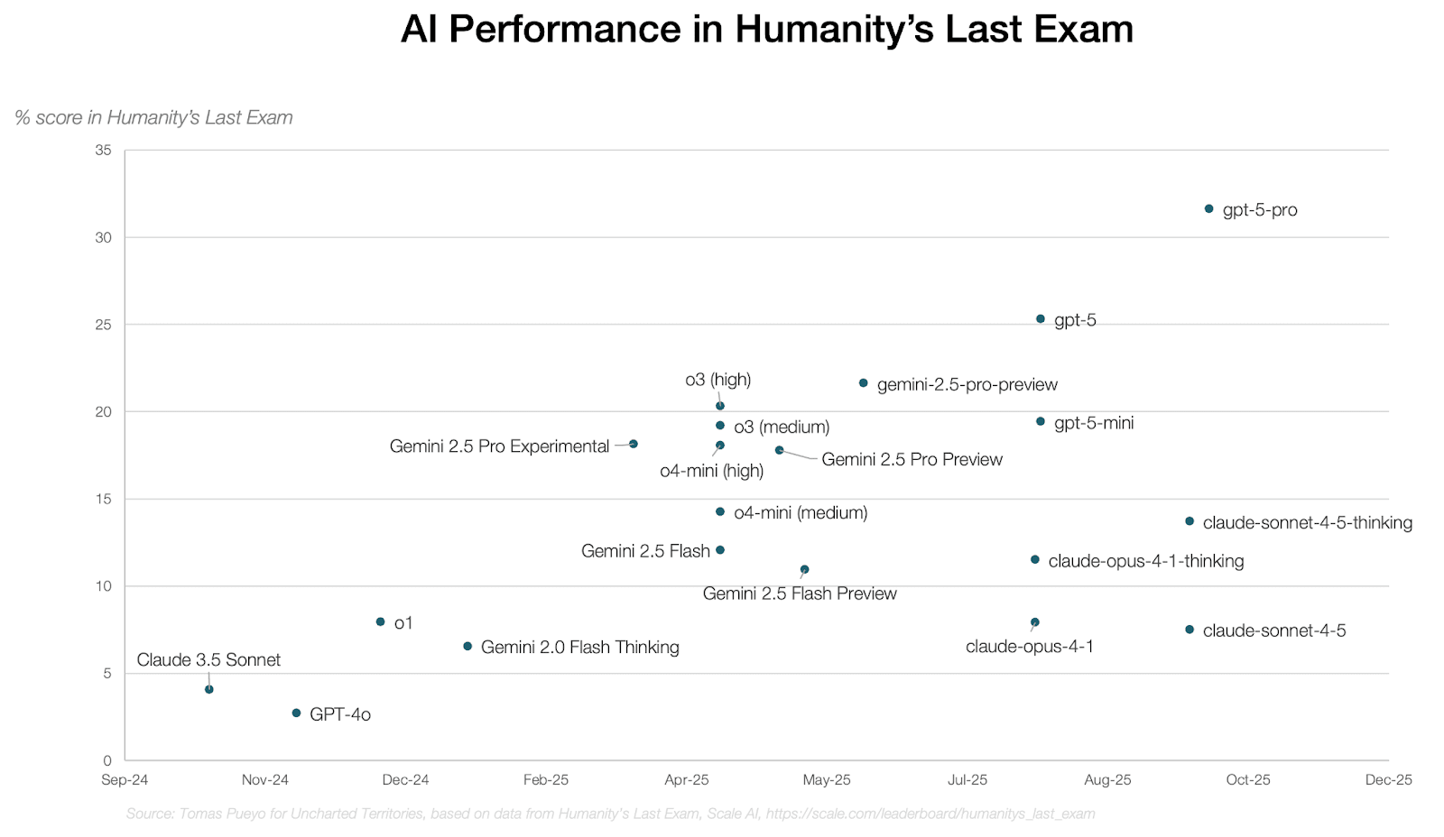 These AI performance evaluations (“evals”) were designed to last a very long time, but they last less and less. The ultimate eval (named “Humanity’s Last Exam”) was meant to last years or decades by making questions extremely hard for AIs. It hoped to remain relevant until AGI. Instead, in less than a year, GPT has gone from a ~3% score to ~32%.
