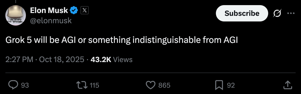 Elon Musk thinks AGI will be reached at the end of this year, or the beginning of next year: